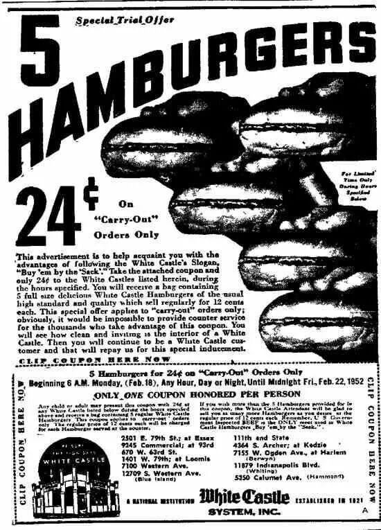 I know it’s from the ’50s but it looks and reads like something out of the ’20s. “You will see how clean and inviting is the interior of a White Castle. Then you will continue to be a White Castle customer and that will repay us for this special inducement.” Man, they *really* spelled it out! The guy who wrote that ad must have been like seventy years old.