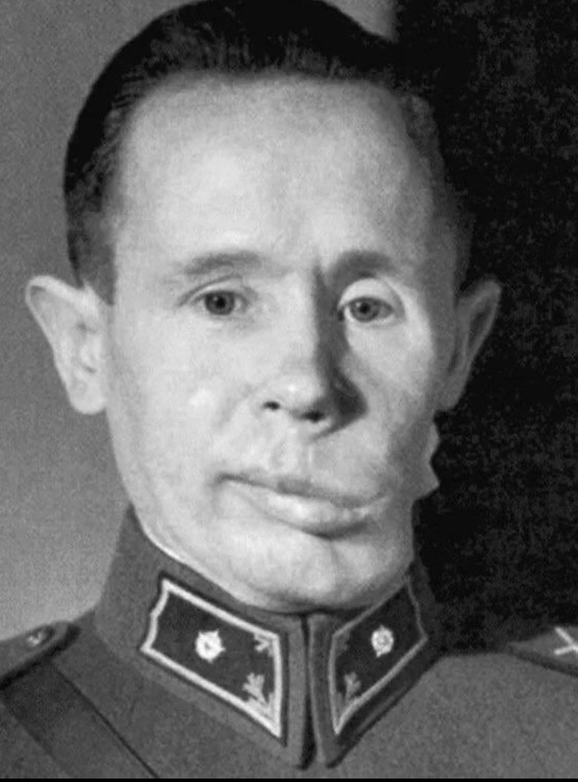 For anyone wondering: his chin was from an injury he sustained. In 1940, an explosive round disintegrated the side of his face and he was initially pronounced dead.