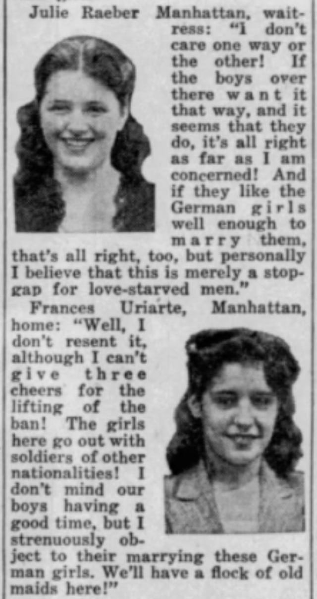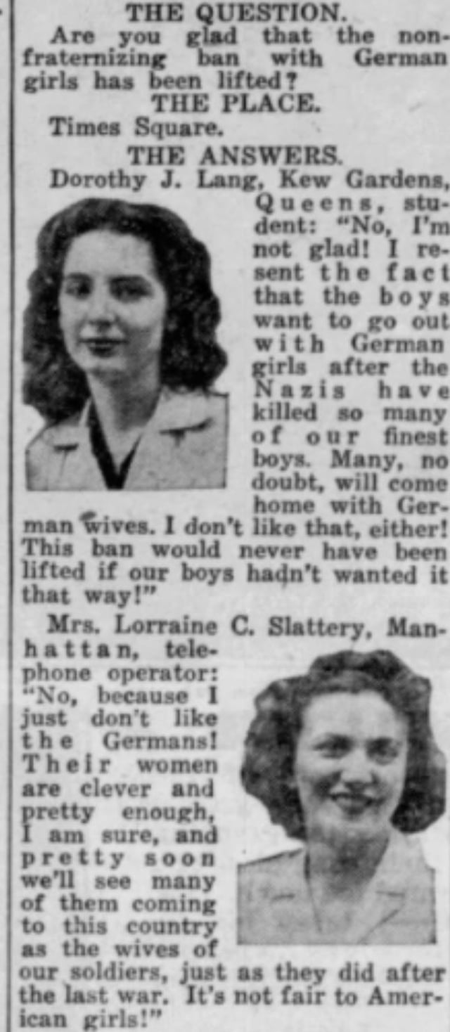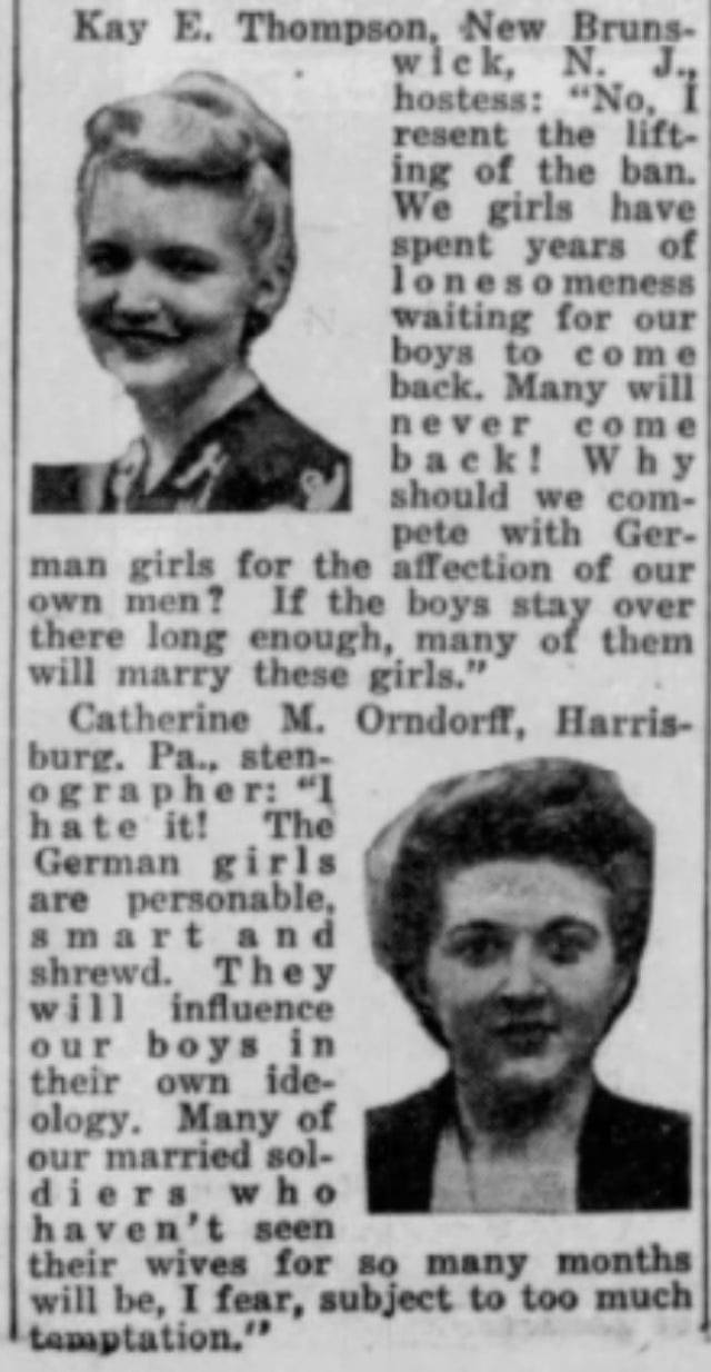 I’m not surprised these women were frosty to German women, especially with the added angle of defeat and “they’re coming here, taking our men”.