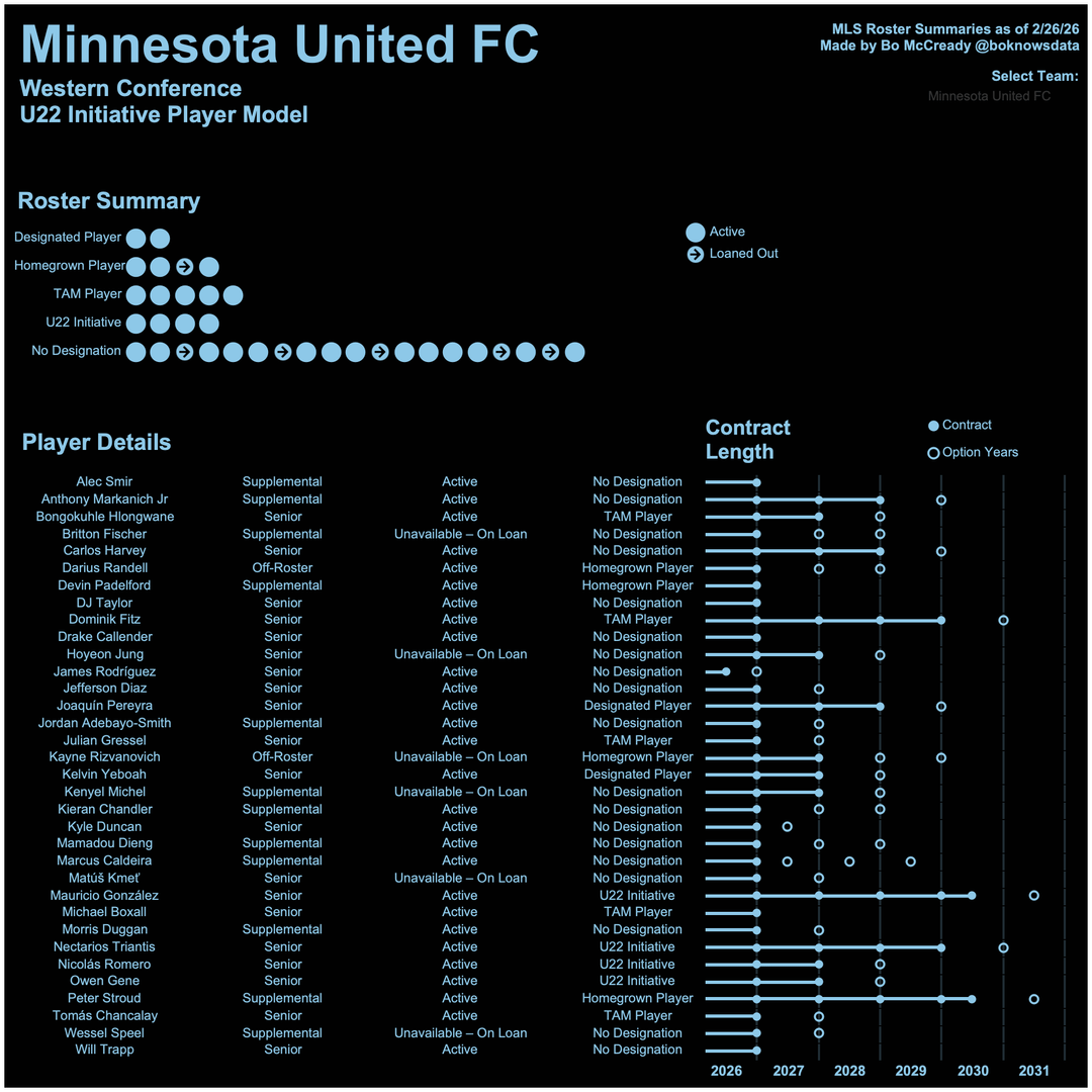 Every season, Major League Soccer releases team rosters at the beginning of the season. These rosters come in .pdf form and I always have trouble noticing any trends. So, I built interactive dashboards summarizing each team's roster breakdown with some visual enhancements and contract timelines.