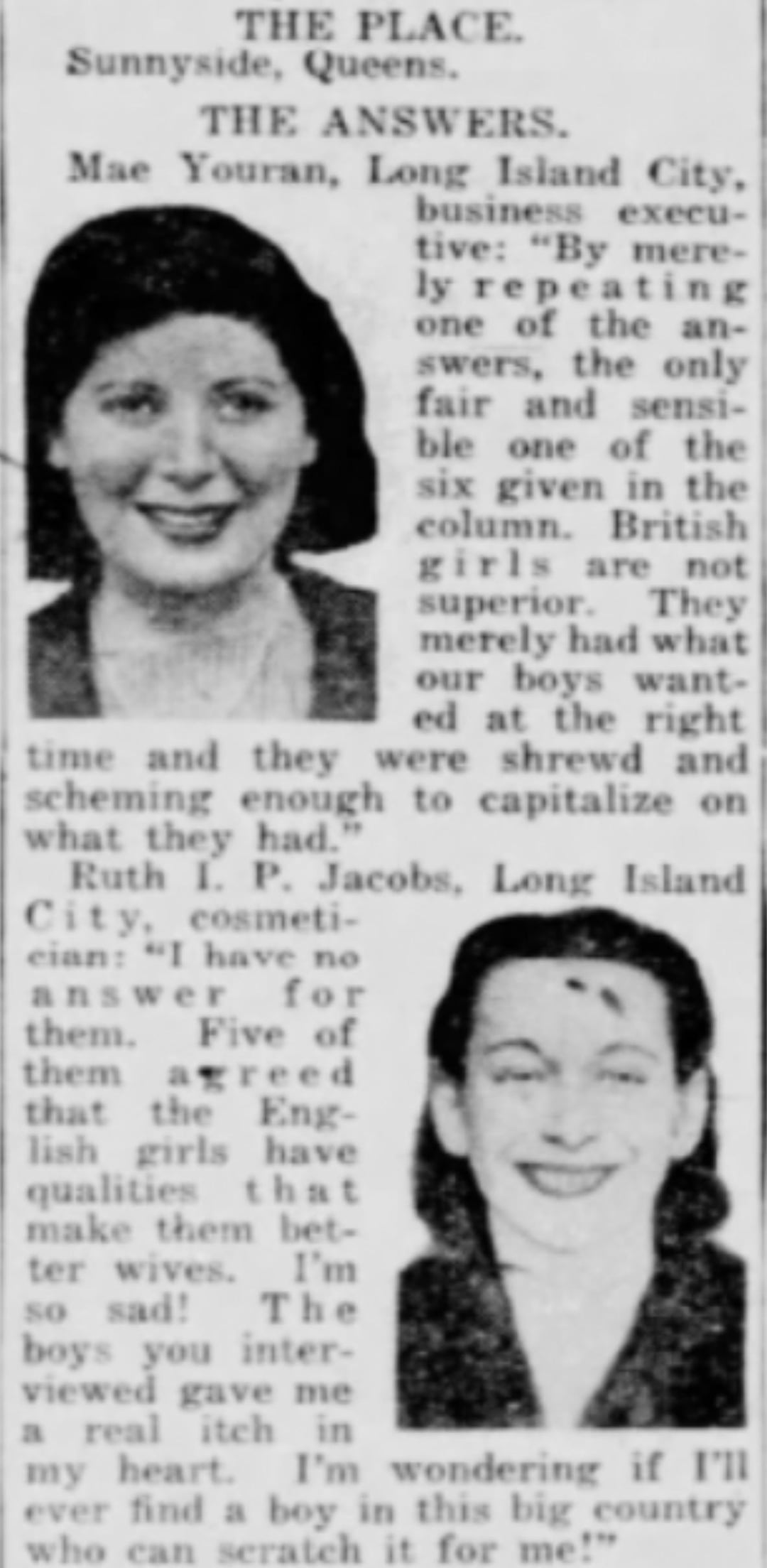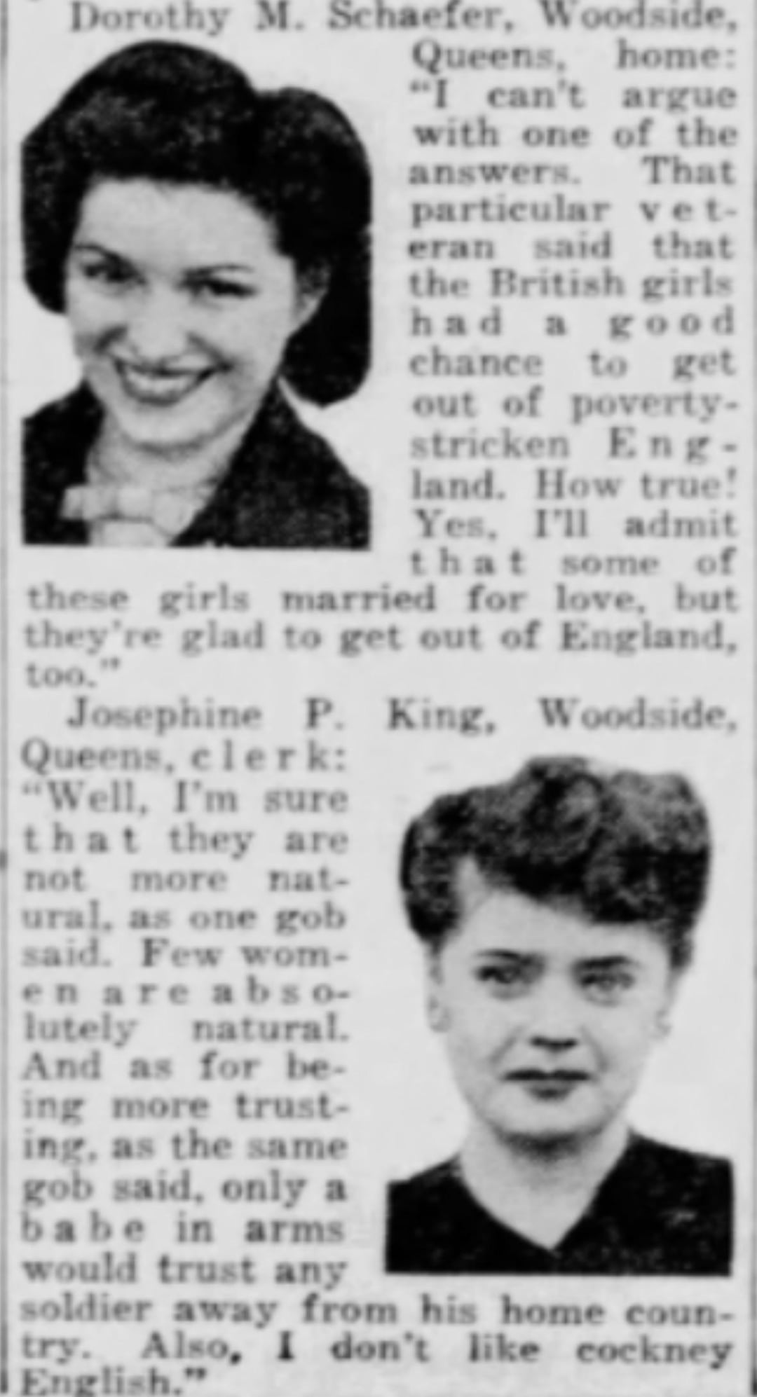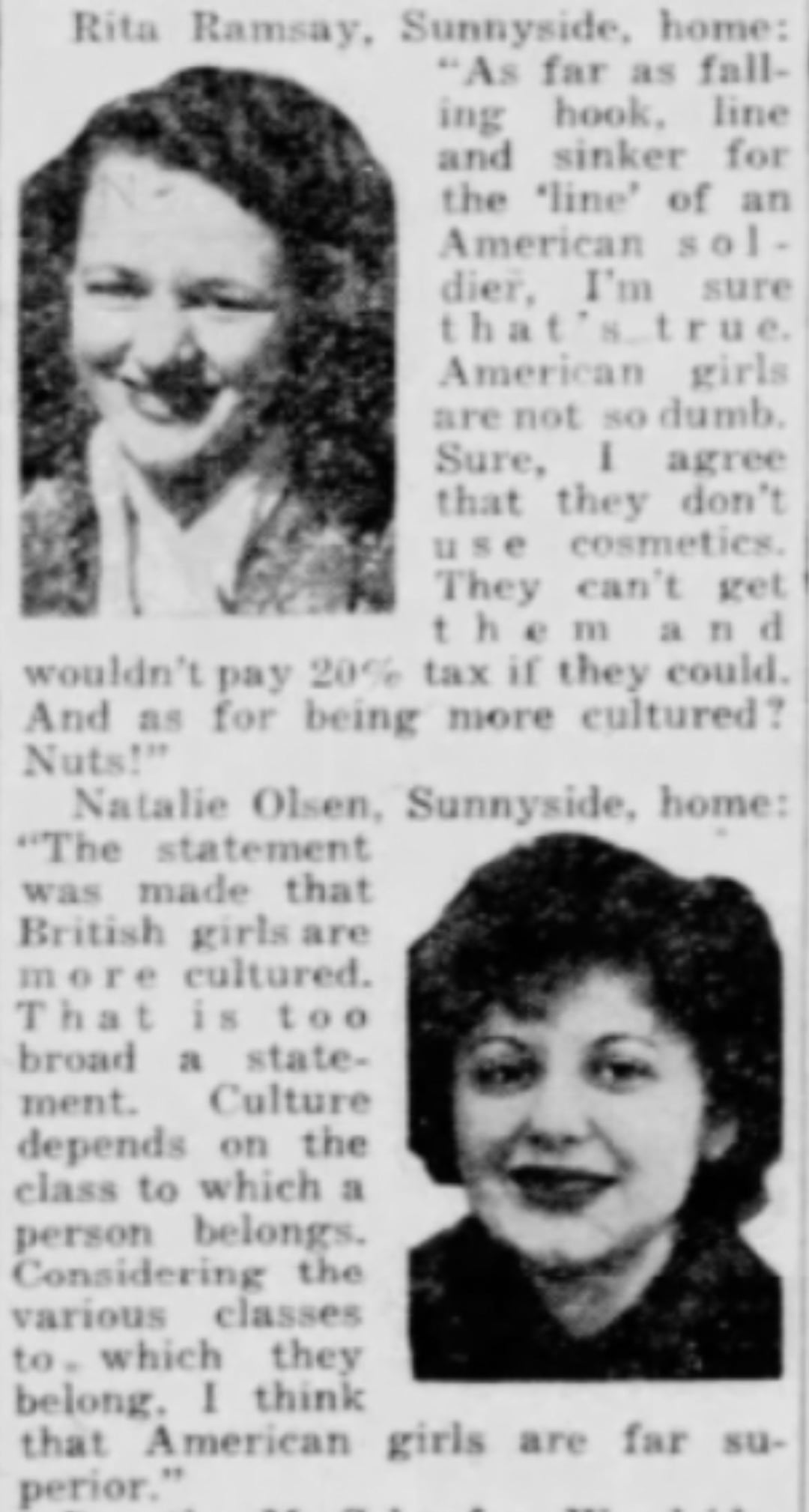 Inquiring Photographer:”American servicemen recently told the Inquiring Photographer why they considered British girls better wives than American girls. How would you answer them?”April 05, 1946
