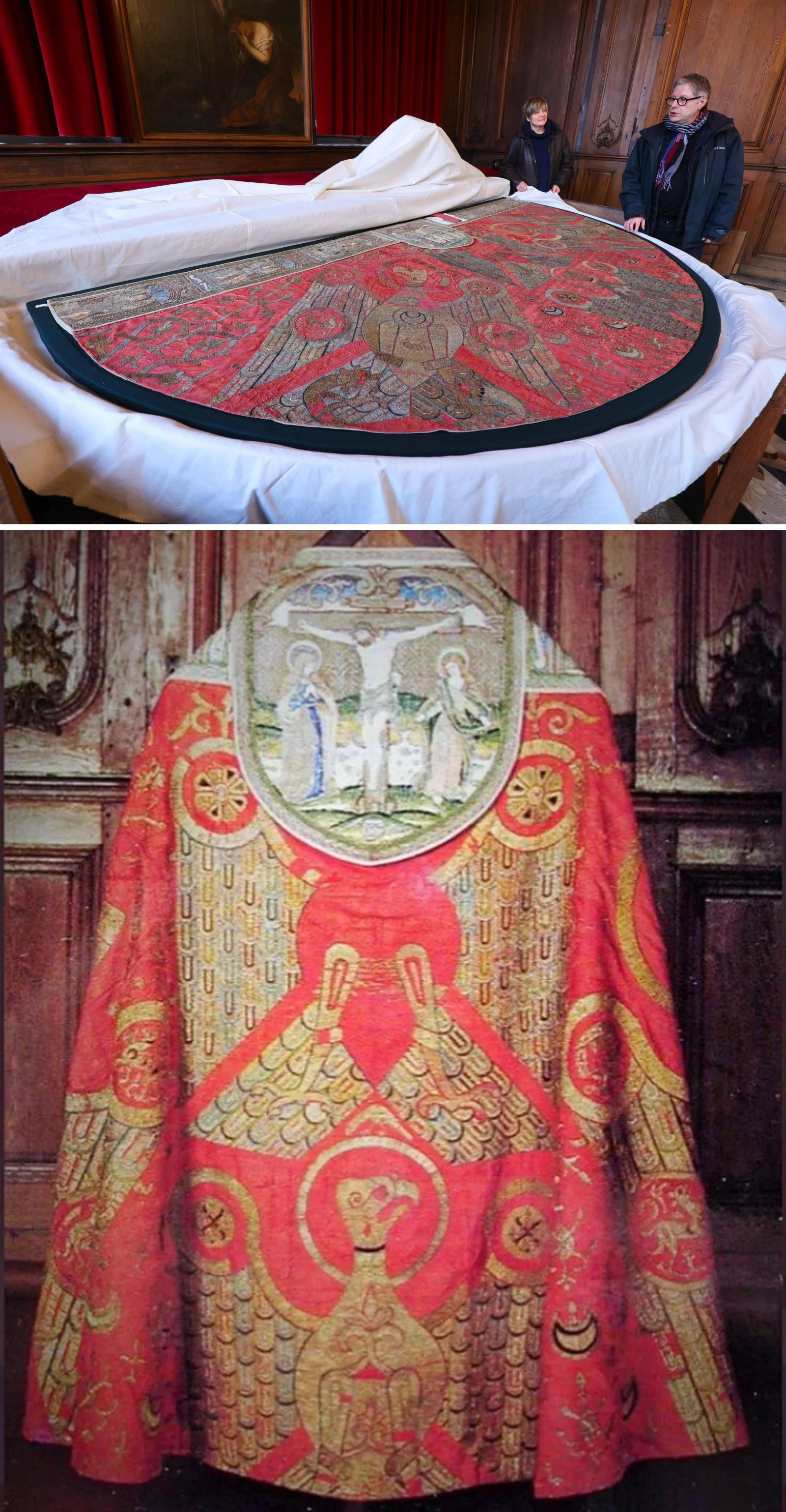 The “Cape of Charlemagne” is a large red silk cloak woven with gold on silver threads and adorned with 4 eagles, griffons and roses. The cope was probably made in 1204 CE, and was in fact the coronation mantle of Frederick II, King of Sicily and Holy Roman Emperor [1600×3077]