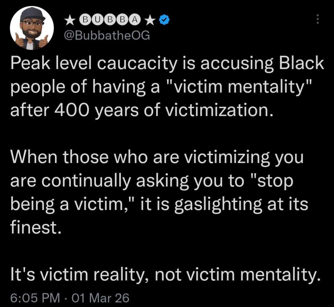 Not specific to what all black Americans have dealt with over the centuries, but a calling card for this type of thinking as a whole is calling the accusations a “bias” or “victim mentality” or whatever it is they tell themselves to cope. I’ve been saying for a long time that it is just reality, and no amount of gaslighting will get me to alter my perceptions of reality to make you feel better about being a piece of shit.