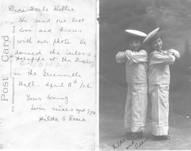 Photo six: My Great Aunty Hilda and Rose in their Sailor Costumes for a performance at Greenville Hall on April 11th 1926.