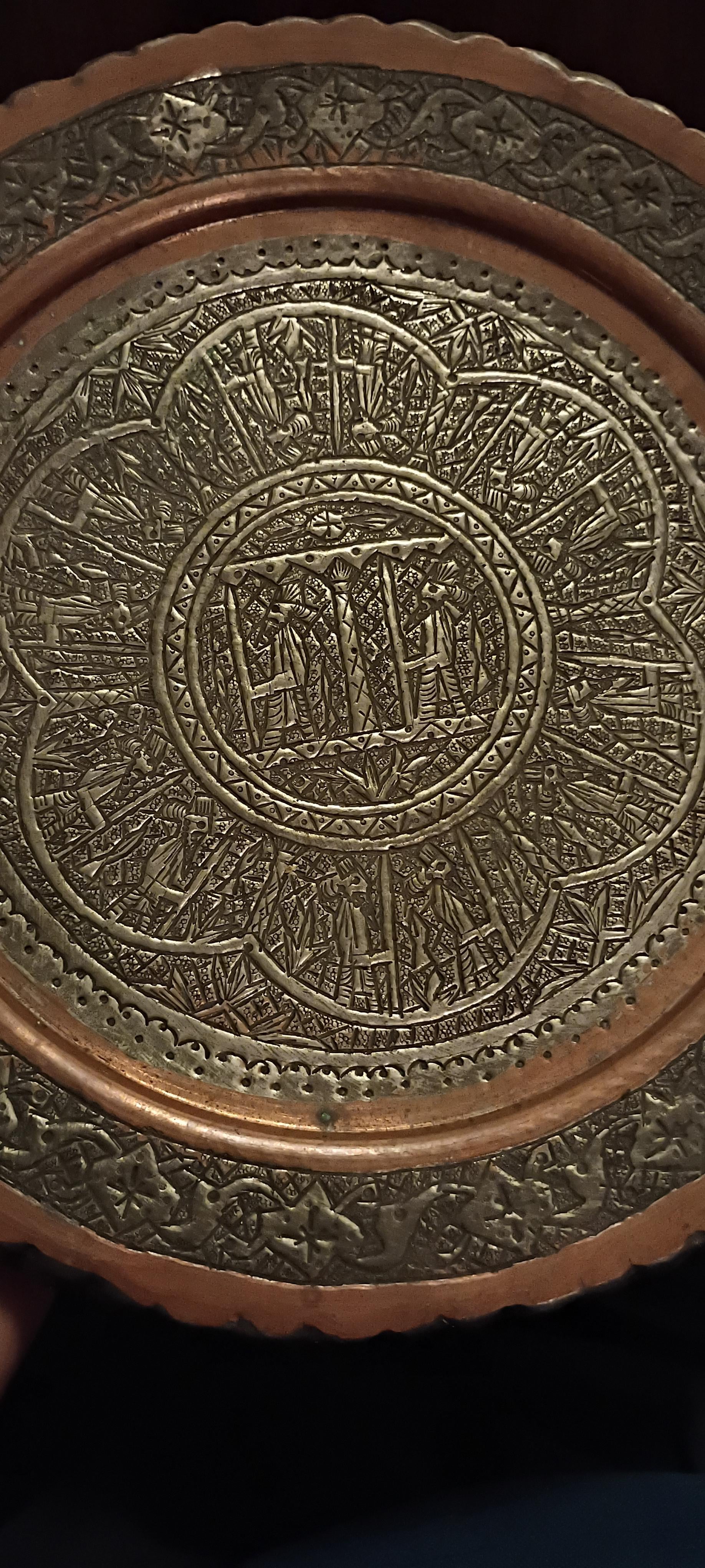 There are two figures in the center of the plate and twelve figures circling the two central figures, and continues outwards with intricate indentations, possibly hammered into the plate.