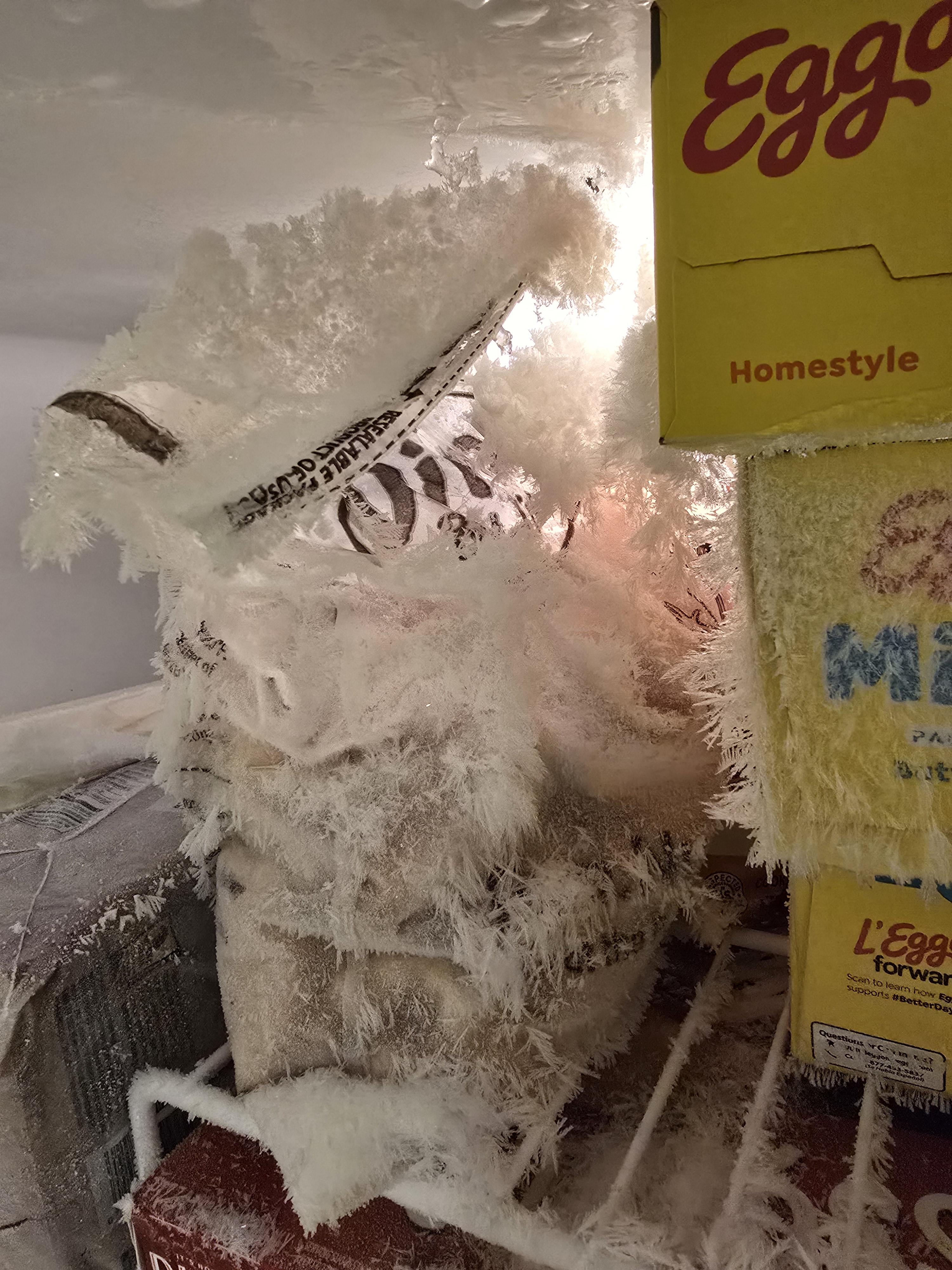 I had that in my old apartment where the freezing compartment had a crack – You did not notice it first other than the compressor running more and more. As I did not have much in the freezer I noticed it when opening it – with the result similar like this but not snow like but a gigantic ice block around stuff inside 🙂