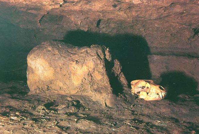 > In as letter of August 7, 1974, M. Casteret tells of the fate of this skull, discovered more than fifty years earlier. He left it in place to be viewed by the experts who were immediately summoned to the Montespan cave. In the intervening two days, a small channel was dug to drain the inner part of the cave, which was flooded. But on returning to the statue, M. Casteret and the invited experts were startled to find the skull gone – stolen! So this skull, seen only by Casteret and Godin, was lost to science, and we shall probably never know which kind of bear was involved in the ritual of Montespan.
