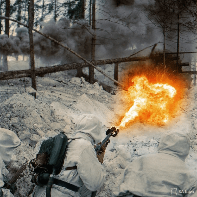 Finnish sappers with a captured soviet ROKS-2 flamethrower during an exercise in Aunus, Finland, March 1943. (colorized) [757×755]