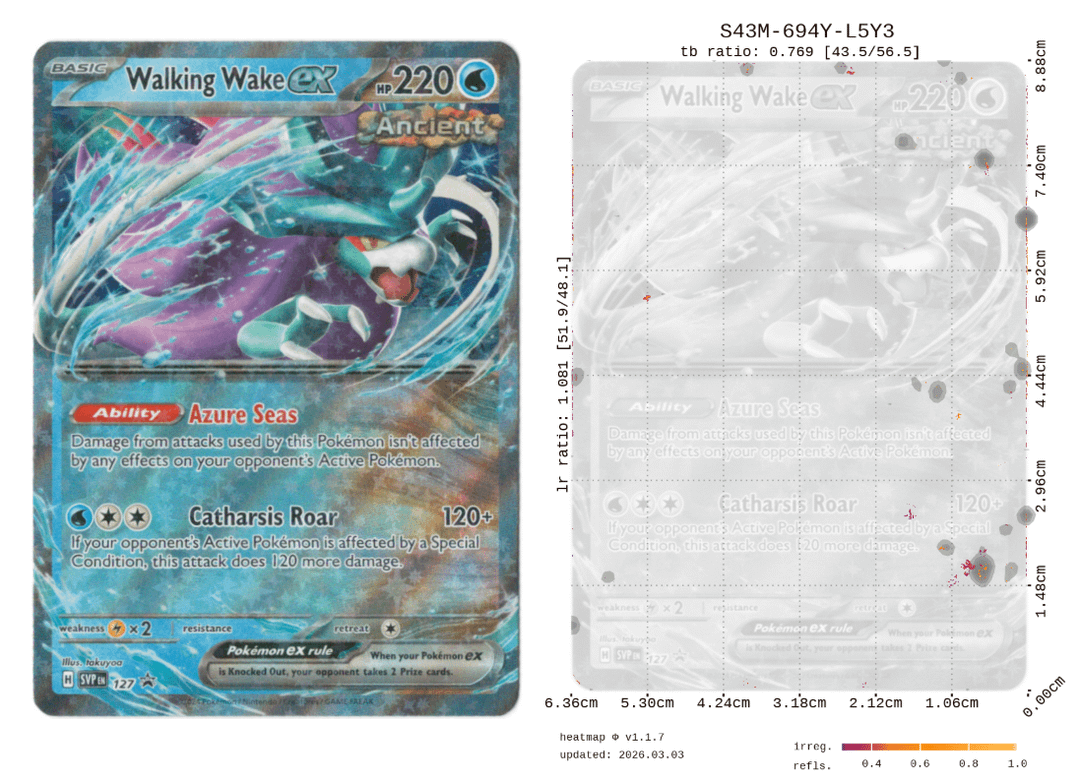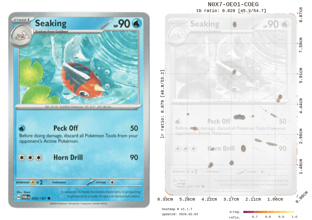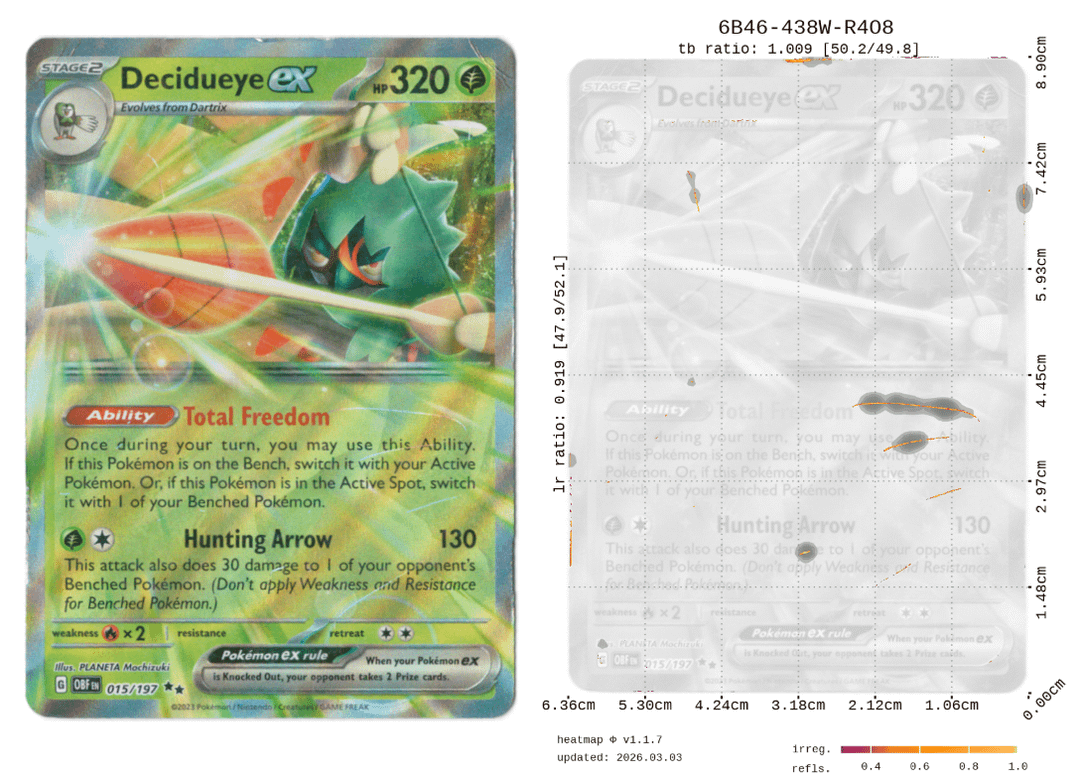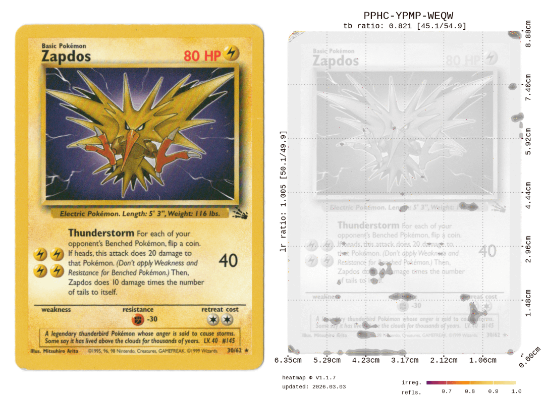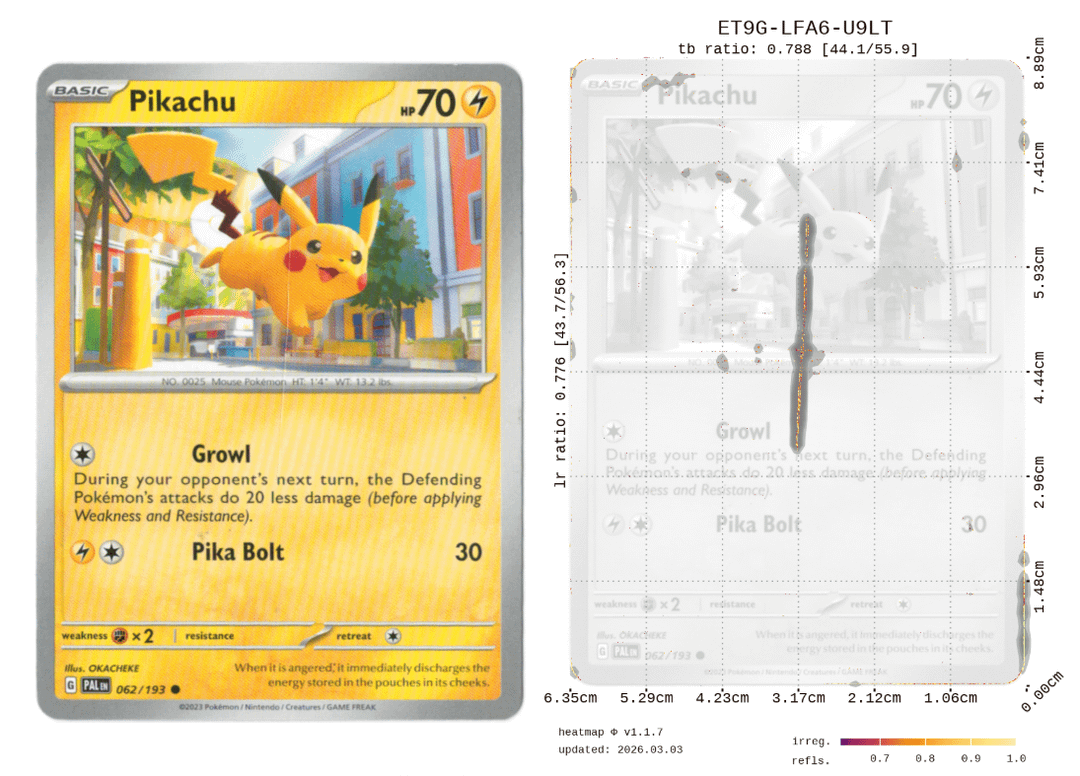 Each card got a composite score of various reflection/refraction metrics on a 0 to 10 scale with a full breakdown of surface and edge scores separately, along with a heatmap showing exactly where the irregularities are. So you can actually see what's dragging the score down rather than just getting a number.