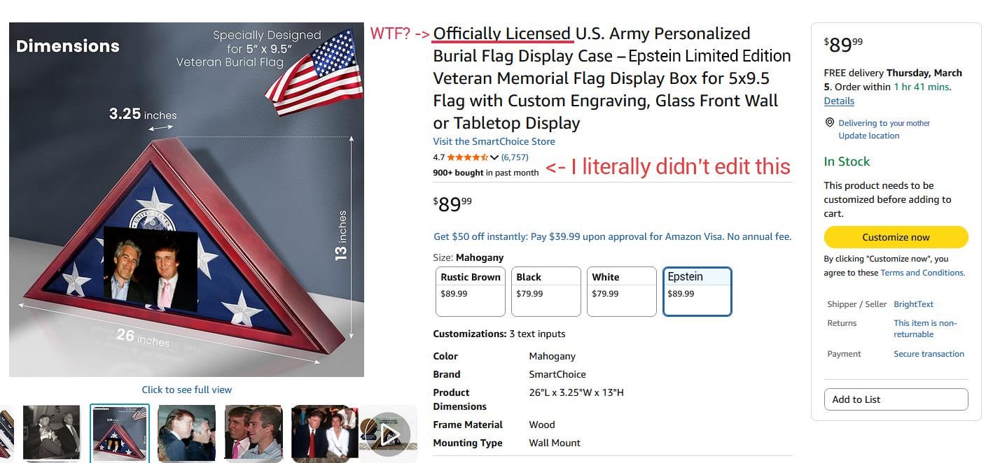 You basically have to add a different version of same item. Like, it’s Lays chips but new Sriracha flavor. Same thing happened here. The first 3 were there and had 6.7k reviews. Someone added Epstein version and added those photos and now it’s part of the listing.
