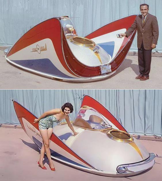 Debuted at the 1960 New York Auto Show . Basically a hovercraft that rode on a 5-inch cushion of air, drawing air through front and rear openings into a 'plenum chamber'. Two jet aircraft starter motors turned aluminum fans at 40,000 RPM . Propulsion and steering were achieved via a revolving jet nozzle that directed thrust for forward, reverse, and turning motions . But it lacked enough power to support a human – good start though !