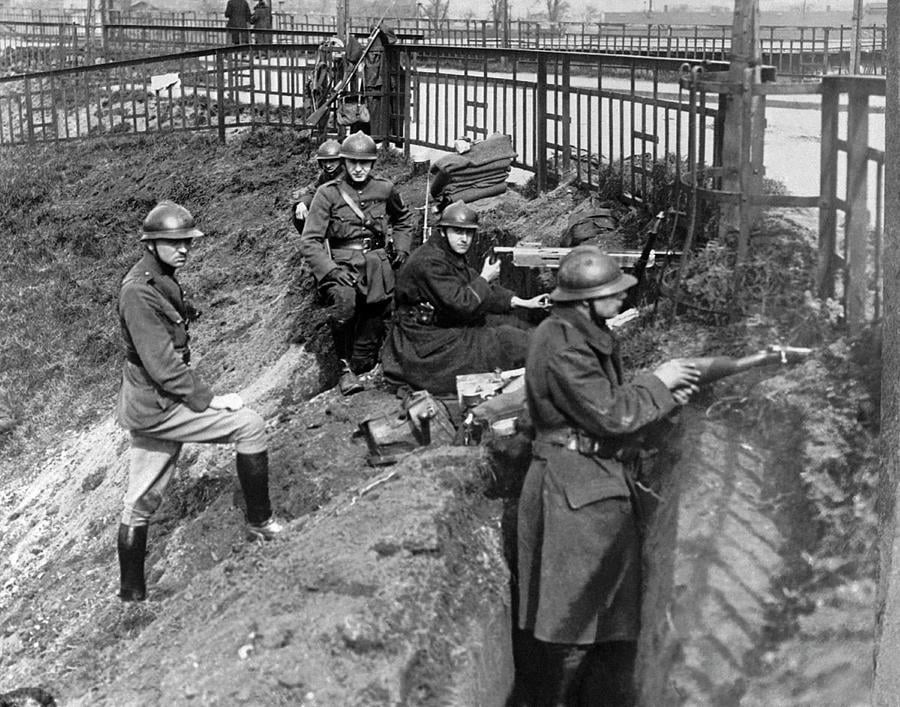 Belgian troops on guard at a Rhine River bridgehead in their Ruhr District occupation zone as the German army fights the Red Ruhr army on the other side of the Rhine, 1920. [900 x 707]