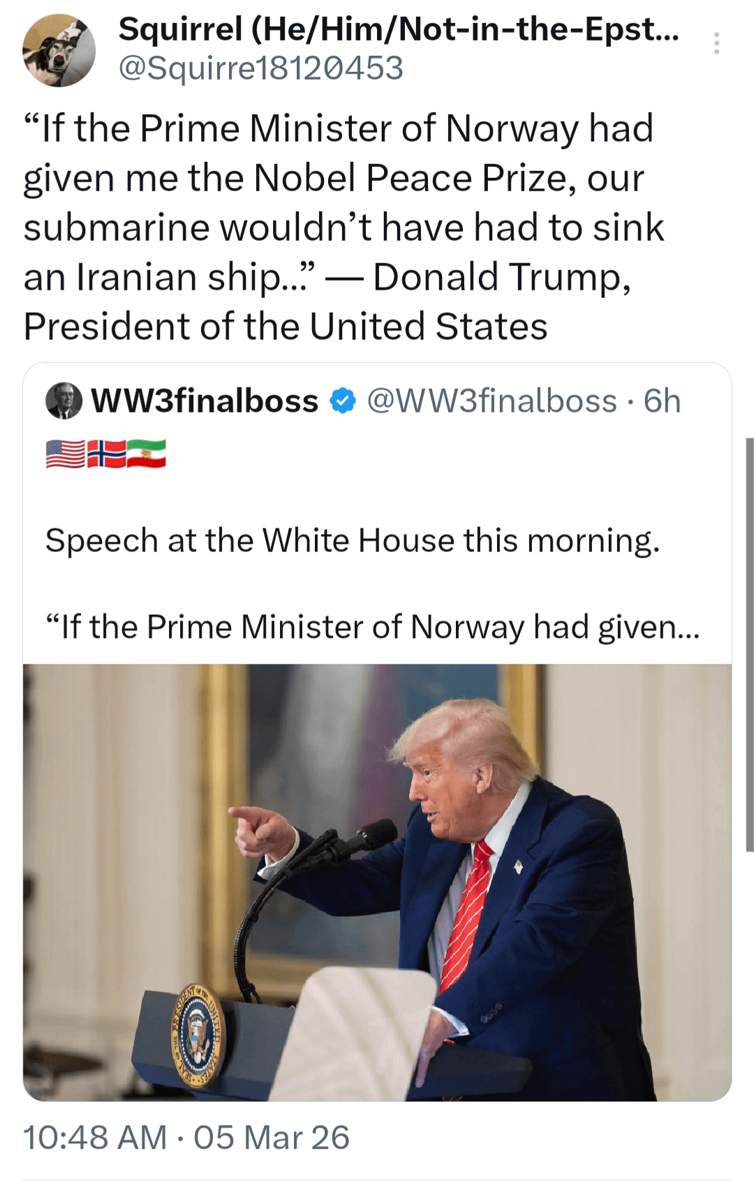 “If the Prime Minister of Norway had given me the Nobel Peace Prize, our submarine wouldn’t have had to sink an Iranian ship”