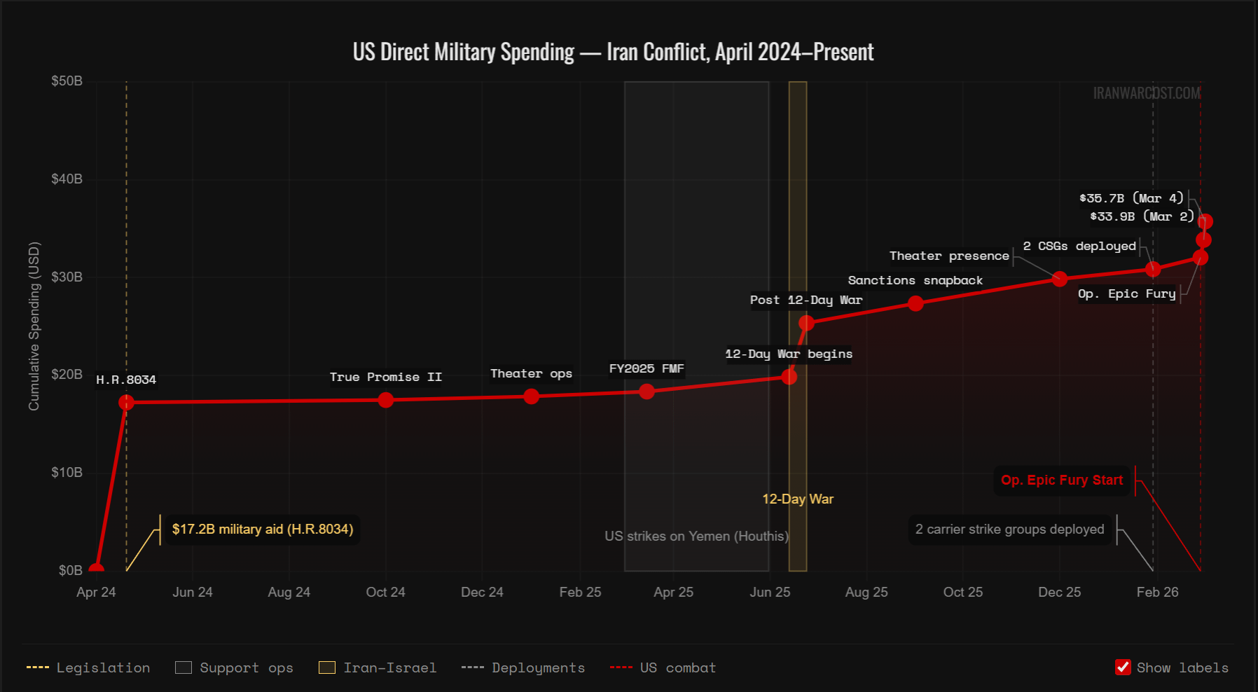 Posted an earlier version of this before and got some great feedback (especially u/ryeballs – thanks!). Hope this is looking better now. I added a legend, labels, and made the chart start at zero to improve the sense of scale. Let me know what you think. I've also got some more data on the site where I'm tracking the Iran war cost: http://iranwarcost.com/