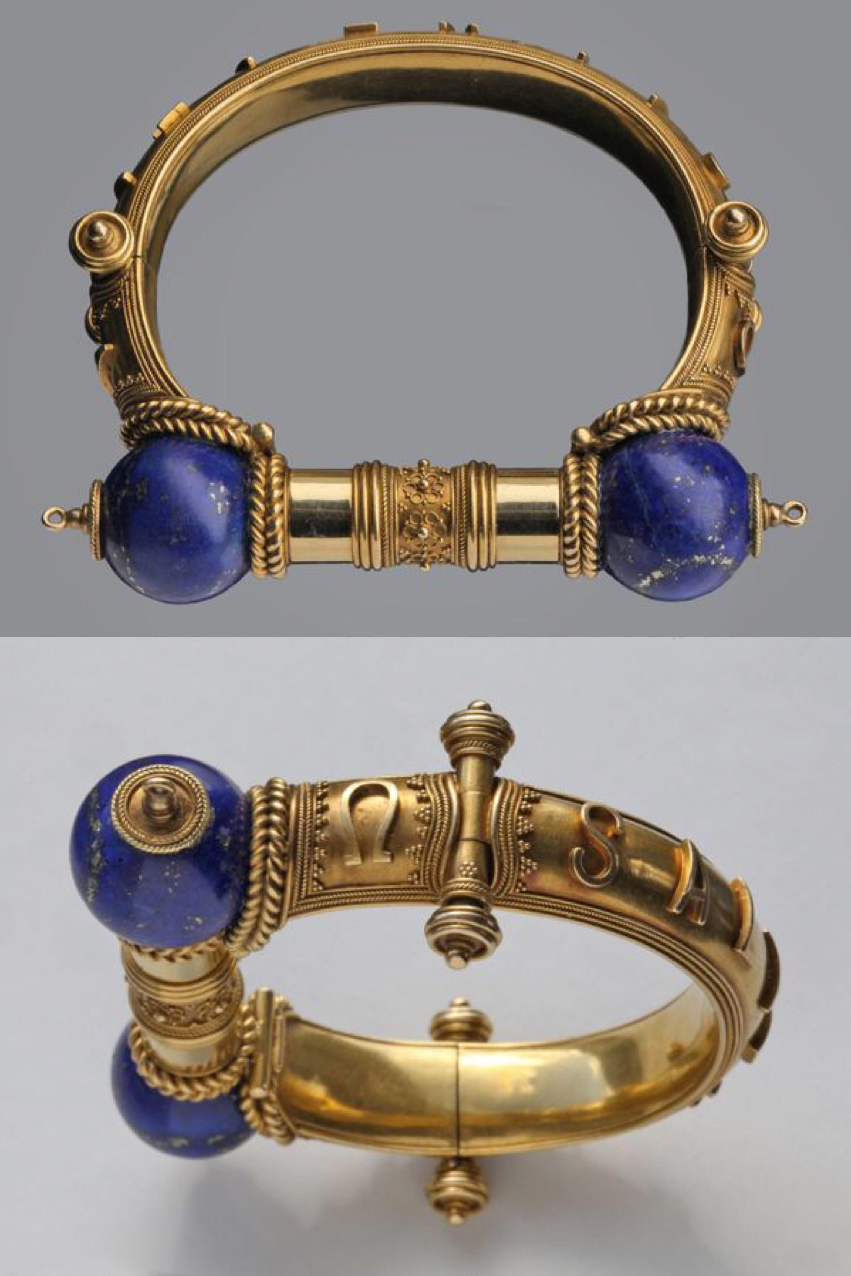 A stunning Victorian gold & lapis lazuli hinged bangle beautifully made & attributed to John Brogden. The design has stylized hinges with locking post clasp, applied scrolled wirework and bead detail. Applied lettering to the band, the classical phrase reading ‘Salve AEI’ (Welcome Always) the Greek letters alpha and omega (the beginning and the end) on either side of the lapis orbs. From [Tadema Gallery](https://www.tademagallery.com/jewellery/d/victorian-etruscan-style-bangle/239260)
