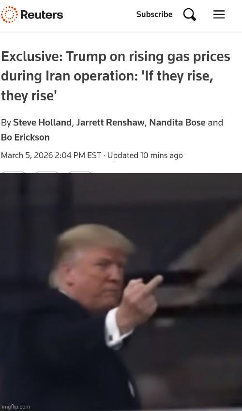 There you go MAGA folks…..we told you so…..he could not give a fuck about the common folk…….he is a criminal, a pedophile, a chronic liar, generally an awful human being……so if you complain about gas prices……you reap what you sow