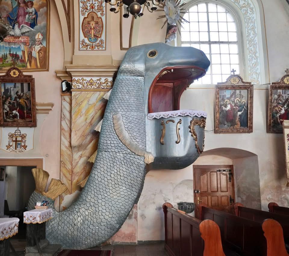 Baroque pulpit in parish church in Dobroszów, Poland. Built c. 1750, rebuilt in 1856, created by an unknown local sculptor, made of wood. [960×850] by Snoo_90160