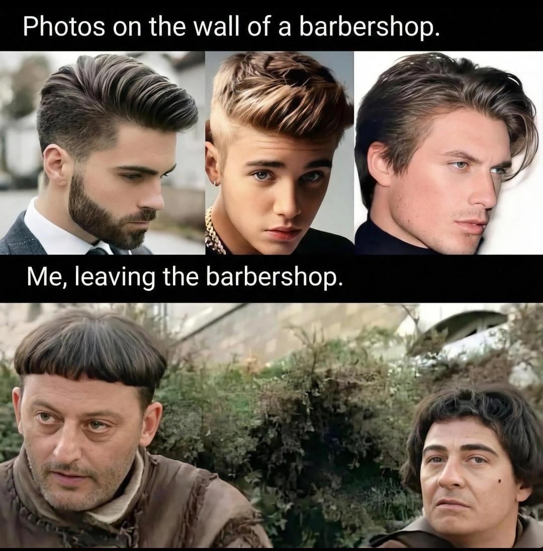 2. This is literally me every time I try to explain to the master that I want “something stylish, but so that I don’t have to invest in the morning.” The result is always the same: I’m ready to shoot a movie about medieval peasants