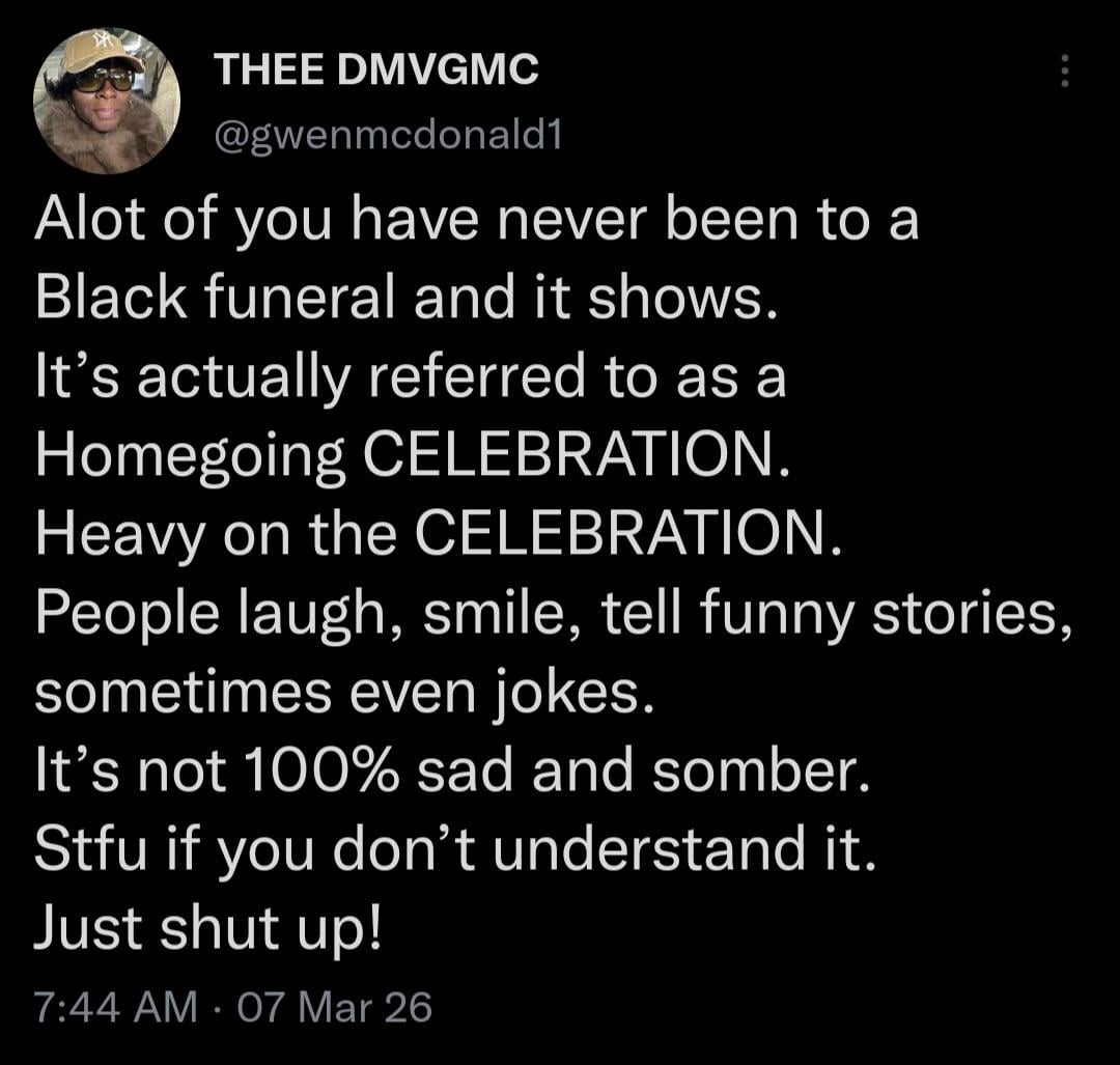 I didn’t realize this was so unique to us until I started going to stuff for my non black husbands family. In his culture you’re encouraged to sit and stay in the grief for months, any kind of upbeat, catharsis is frowned upon. I get it but I do really appreciate our approach to death.