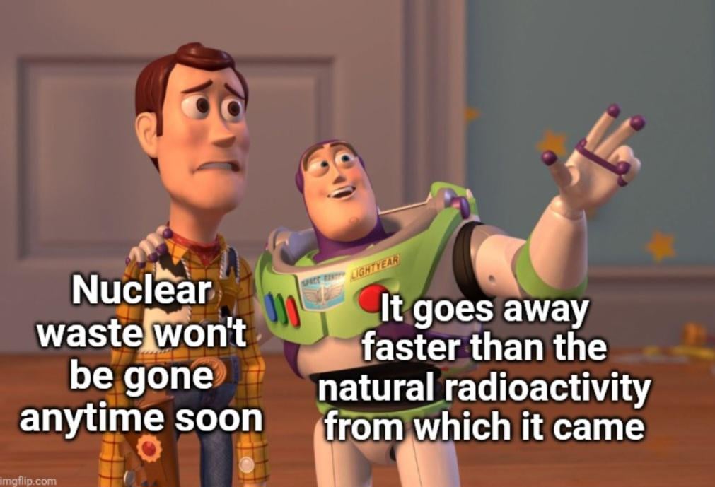 As a big pro nuclear energy, this doesn’t make much sense even if it’s true 😂. The key in radioactivity is the frequency of decay, nuclear waste frequency is relatively high while the natural radioactive sources are mild in comparison. For reference: the nucleus with the longest halving time in nuclear waste are usually in the order of the millions of years while the natural sources can go up 4.5Billion of years. But what does this mean? A higher frequency of decay (shorter halving time) indicates a higher probability to do so, therefore the source is more active and usually more dangerous, but it depends on the kind of radioactive emission (even on that side natural sources are far less scary). So yeah nuclear energy is a big resource and not scary at all once I get to know it so please don’t talk any nonsense, there’s so many different reasons why we should use nuclear energy… there’s non need to be misleading🙃