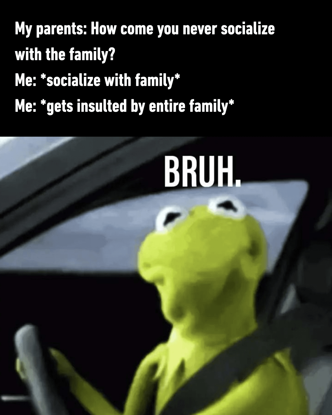 Family gatherings really be a personality roast session. You show up for food and leave with emotional damage.