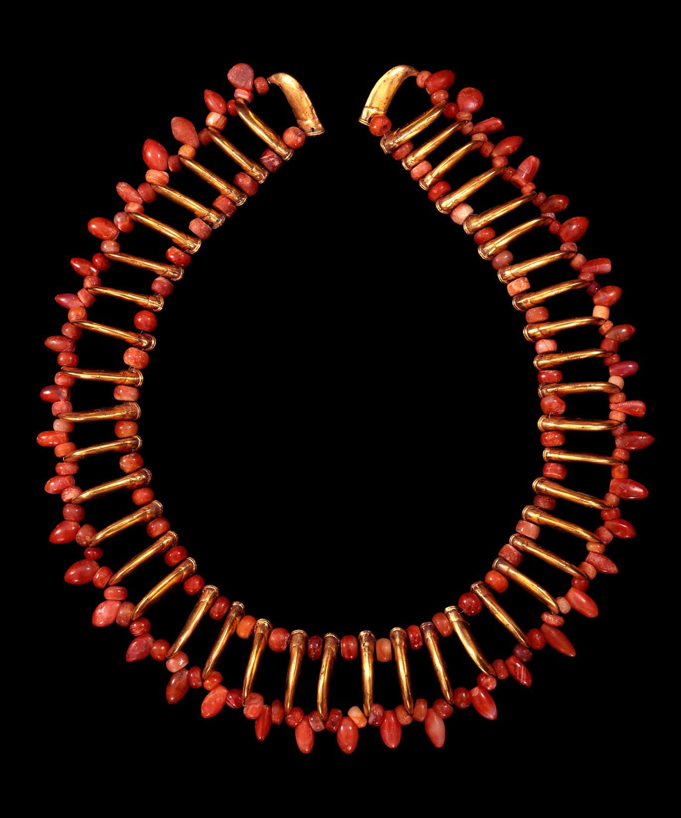 Share Facebook Twitter LinkedIn Pinterest Bluesky Threads A Tairona necklace made of red stones and gold alloy claw shaped beads, 900-1600 CE, now housed at the Museo del Oro in Bogotá, Colombia [1368×1643] by Fuckoff555