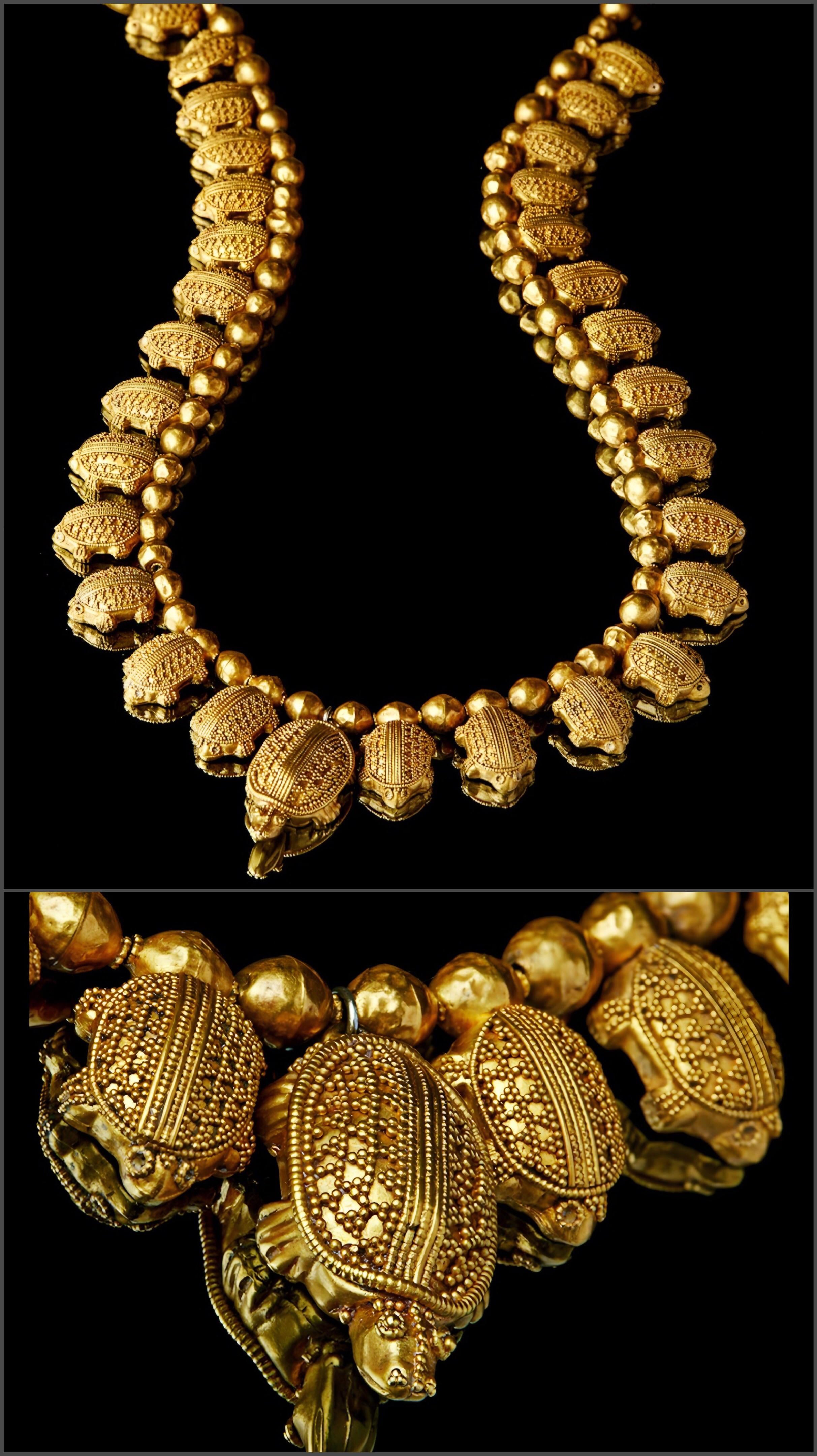 Gold, weight: 85.905 g. Thirty-one pendants in the form of charming turtles make up this necklace. One large central turtle and 30 smaller turtles. The eyes of the thirty small ones were done with glass inlay, while those of the large one are of gold. The carapaces are decorated with granulation. The archaeology and artifacts of Colchis are intermingled with Greek and Persian motifs and local styles and traditions. Metalworking, whether in gold, silver, iron or bronze, was a traditional focus of Colchian art and craftsmanship.