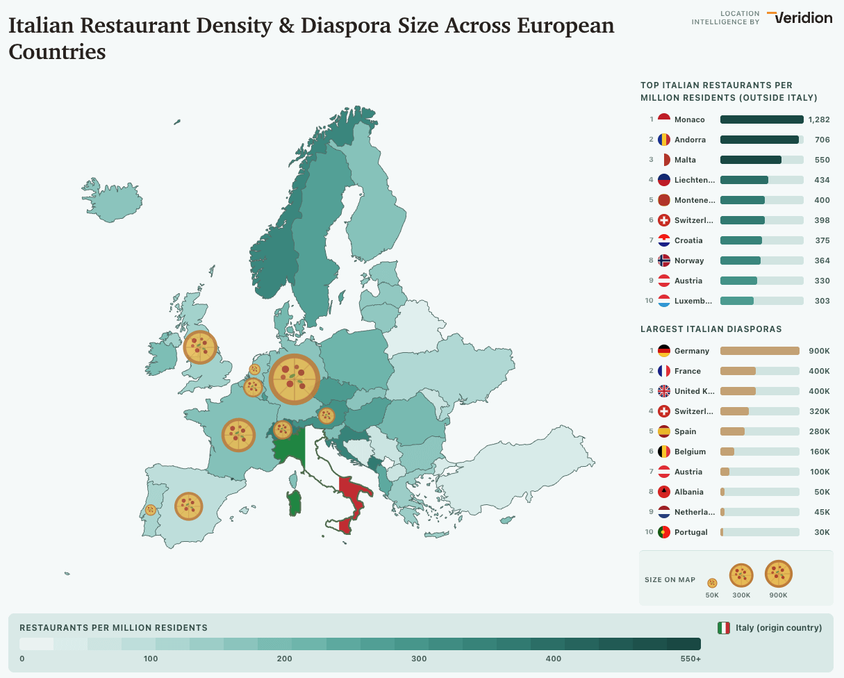 Data: Restaurant identification and total counts from Veridion, cross-referenced with BoldData, SmartScrapers/Google Maps, TripAdvisor, CGA by NIQ, and national statistics. Diaspora figures from Eurostat.