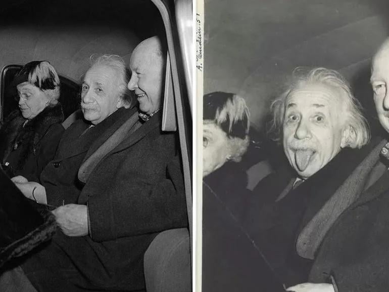 > The iconic (and comical) portrait of Einstein sticking out his tongue for the photographers on his 72nd birthday. A very rare example signed by Einstein. Einstein is shown seated in an automobile between Dr. Frank Aydelotte, head of the Institute of Advanced Study in Princeton and his wife, returning from a celebration of Einstein’s 72nd birthday at the Princeton Club. For the benefit of a gaggle of photographers, Einstein stuck out his tongue, but only Arthur Sasse, a United Press International photographer, managed to capture it. Sasse’s editors debated the appropriateness of the photograph for some time before submitting it for publication. It became the most popular photograph ever taken of the Nobel Laureate, demonstrating his playful side. Einstein was so delighted with the photo that he ordered multiple prints of this image. Most examples of this photograph are cropped to Einstein’s head, while this example shows the entire scene in its proper context.
