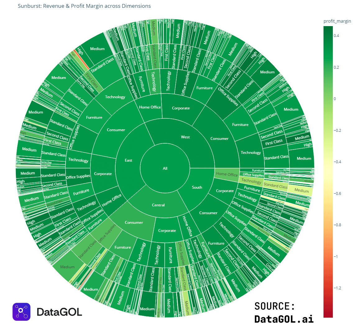 I personally wouldn’t visualize ANYTHING with a sunburst chart, especially one with this many levels. Trying to visually compare any two data points is virtually impossible, finding the largest or smallest is virtually impossible, literally the only thing this tells me is, “Almost everything is green.” This would have been better shown in a table.