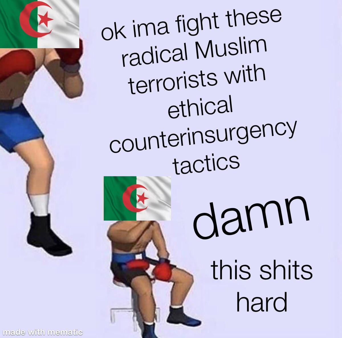 Counter-Insurgency tactics! But don’t worry, nothing illegal. These are French citizens after all. Unfortunately the reality on the ground was rampant torture, kidnappings, massacres, summary execution, coerced confessions and tons of rape. It was all for naught in the end of course. Algerians decided they wanted nothing more to do with being French and France conceded their point in 1962 with the Evian Accords.