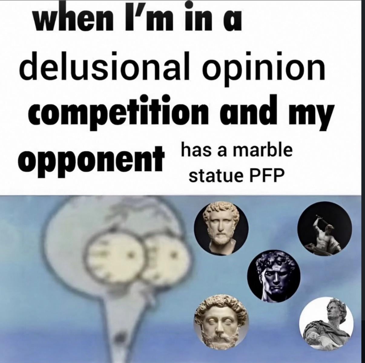 Marble statue/Anime/Furry/country flag behind/on face always got the worst takes