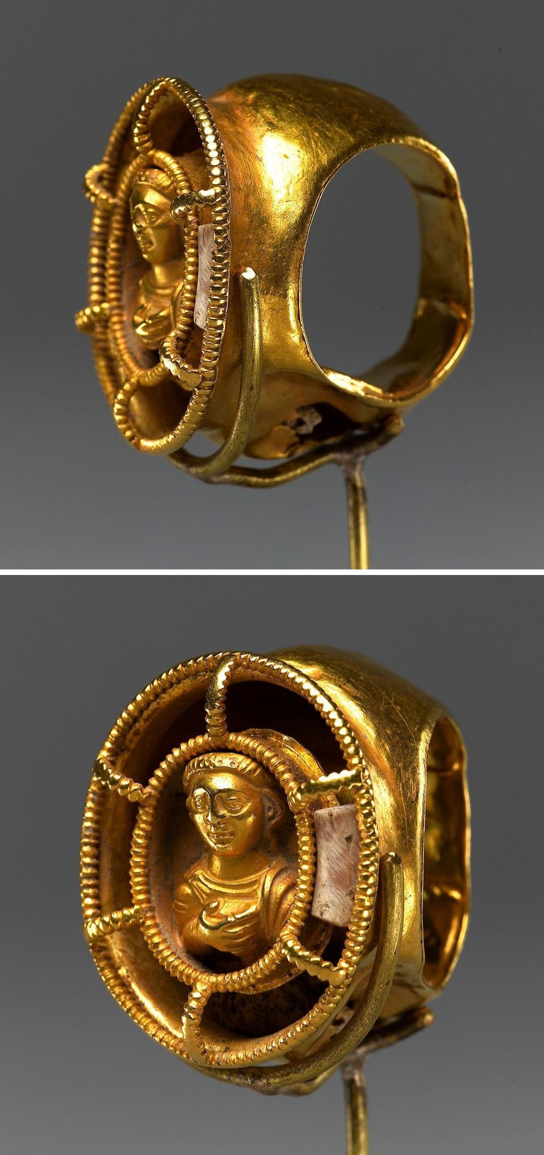 Ring with bust figure holding a wine cup, 1st century CE. Gold inset with a semi-precious stone. From Gandhara (in present-day northwestern Pakistan and eastern Afghanistan), now housed at the Ashmolean Museum in Oxford [1080×2290]