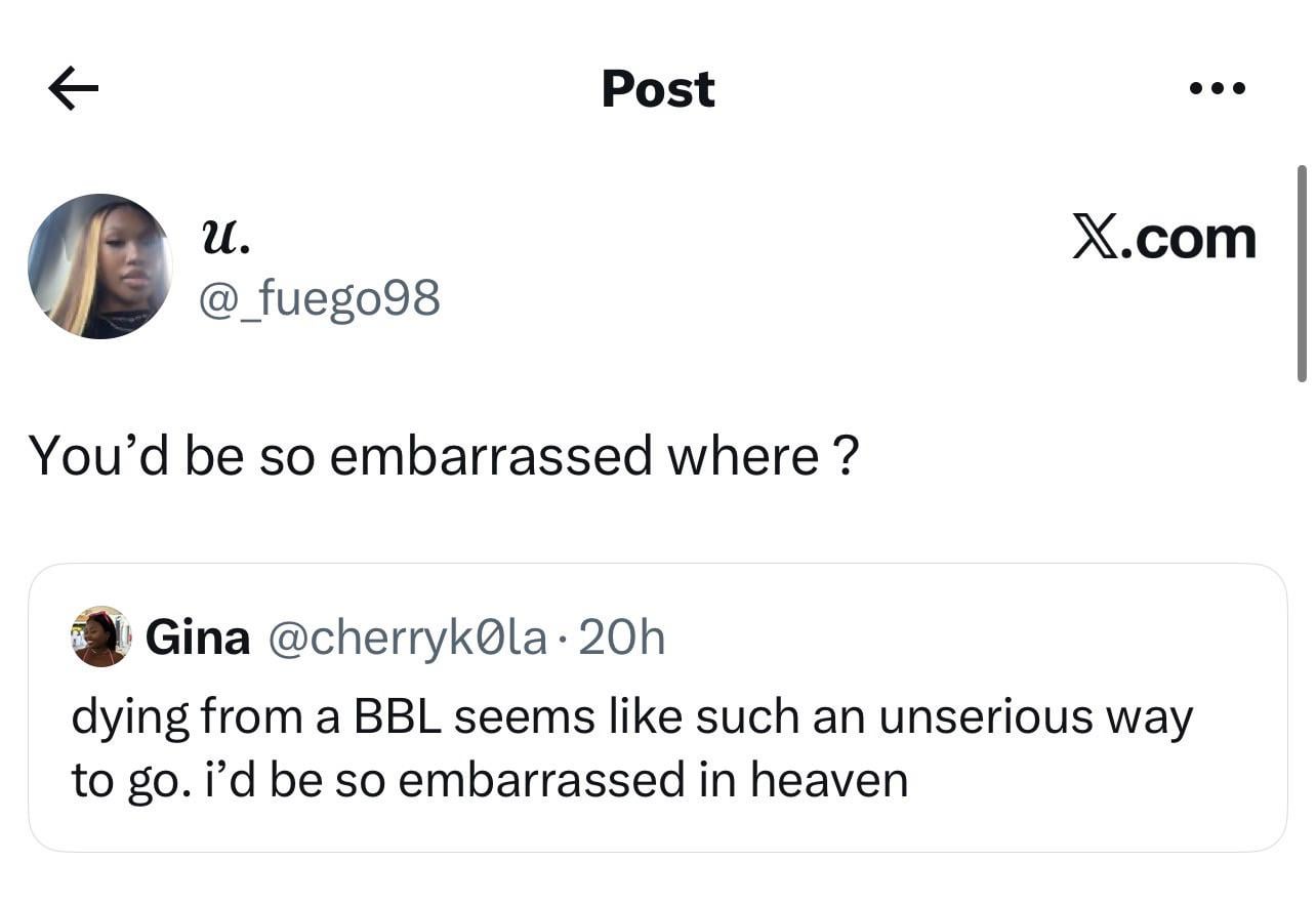Just watched a video of a Brazilian woman with all of her butt flesh rotted or removed by surgical means because of a bootleg BBL. I genuinely feel bad for women who feel so insecure about their bodies that they jeopardize their lives.