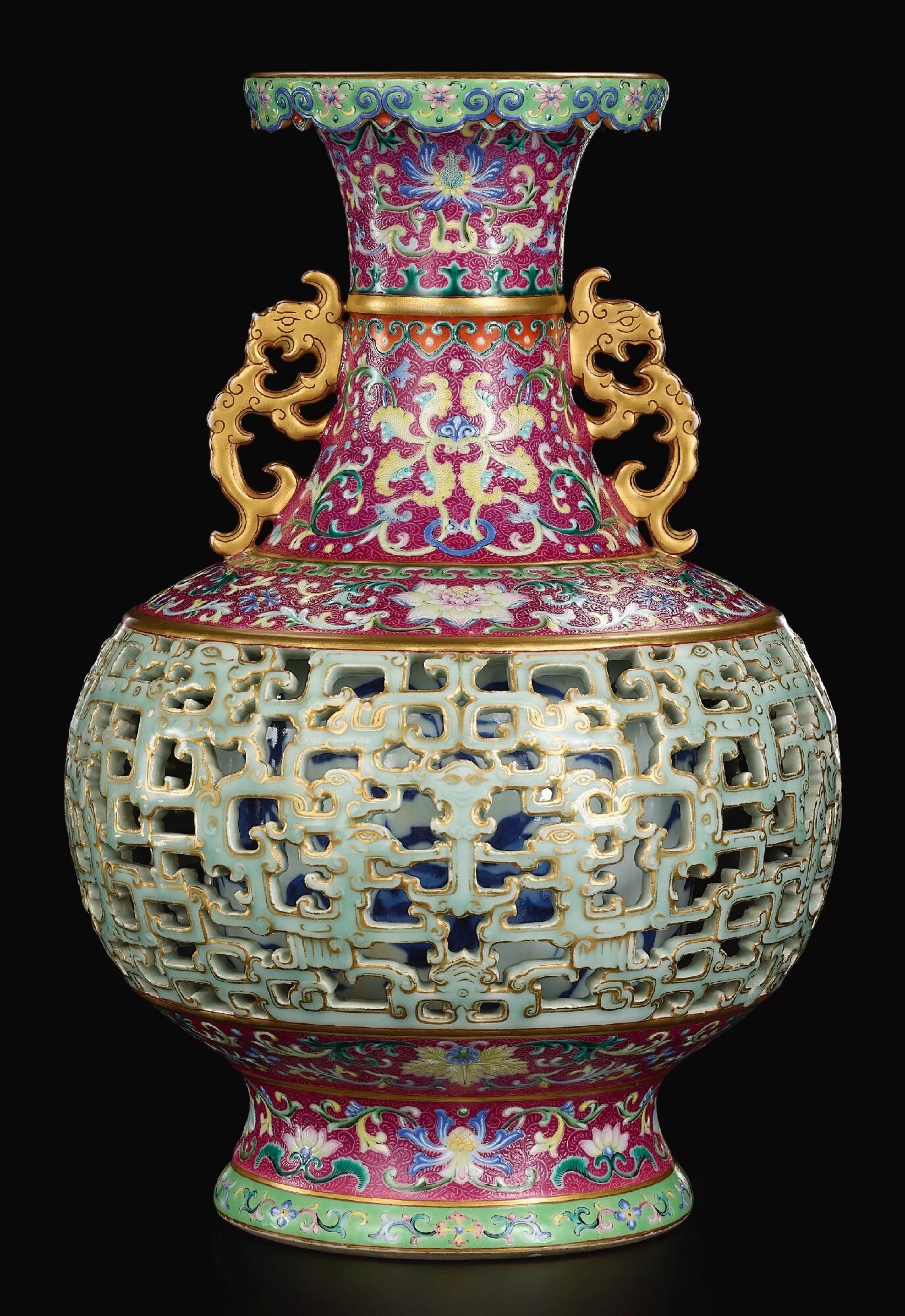 “A superbly potted with a pear-shaped body rising from a splayed foot to a tall waisted neck below an elaborately overhanging cusped ruyi collar at the rim, the neck flanked by a pair of gilt sinuous dragon handles and opulently decorated with three friezes divided by gilt bands, each frieze enclosing symmetrically arranged luxuriant flower garlands composed of stylised blooms and Rococo-inspired whimsical undulating acanthus leaves with feathery fronds, all against a rich puce ground picked out with scrollwork rendered with needle-fine sgraffiato engraving, the puce-ground floral design meticulously repeated along the lower body and foot, the prominent and rounded lower section of the body ingeniously modelled with a celadon-reticulated wall of interlaced dragons, interspersed with archaistic bird and bat-like motifs, all emphasised with gilt borders, the intricately carved wall revealing an inner vase decorated in shaded tones of cobalt blue with nine succulent peaches borne on leafy branches, all between lime-green bands of detached florets flanked by scrolling foliage encircling the ruyi collar at the rim and the foot, the base enamelled turquoise and centred with an underglaze-blue six-character seal mark reserved in a white square.” [Sotheby’s](https://www.sothebys.com/en/auctions/ecatalogue/2020/the-harry-garner-reticulated-vase-hk0940/lot.1.html?locale=en)