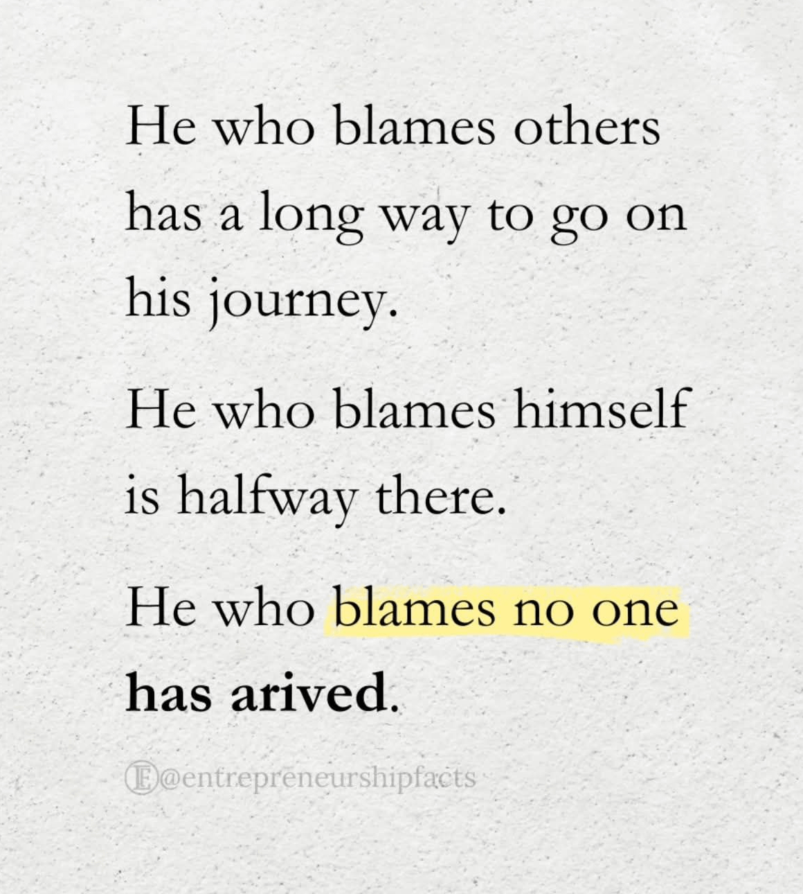 The tricky part is that ‘blame no one’ doesn’t mean ‘excuse everything,’ it means you’ve accepted what happened and you’re too busy fixing it to waste time pointing fingers.