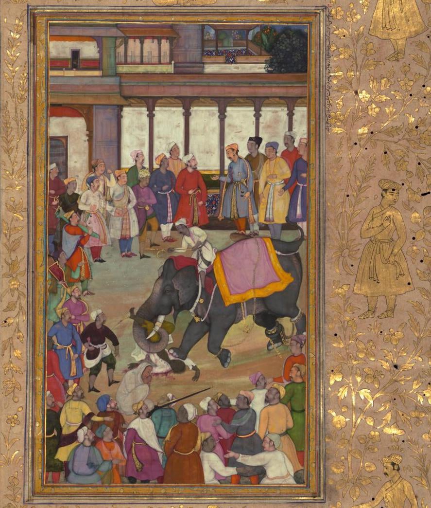 Execution by elephant, from the Akbarnamah, the official history of Emperor Akbar. By Abu al-Fazl ibn Mubarak. India, Mughal Empire, 16th century [887×1044]