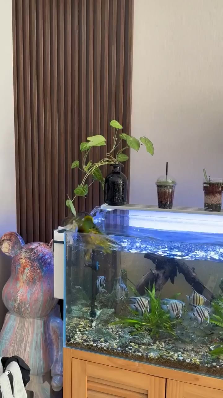As I commented on this when it was posted in funnyanimals, before it was removed, this is bad for everything involved. Bird dust and possibly poop in the fish tank and fish bacteria and poop in the bird. Fish can also carry tuberculosis. There’s a lot that can go wrong.