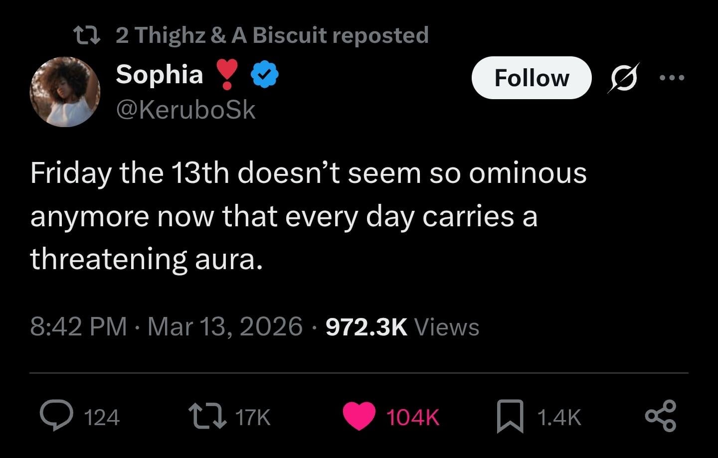 No reason to fear Friday the 13th when everyday is like walking across a field of landmines in heels while someone shoots at you with rocketlauncher.
