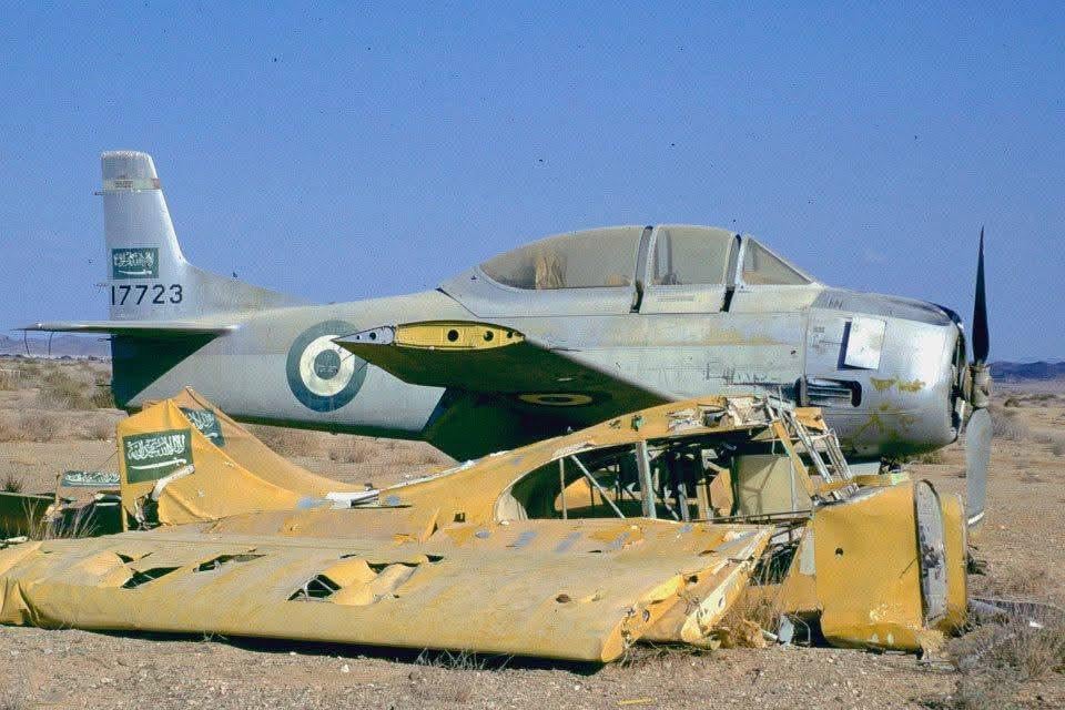 North American T-28A Trojan trainer aircraft (No. serial 17723), from the Royal Saudi Air Force (RSAF), at the Tabuk Air Base, c. February 1998 – photo by Peter de Groot. [960 x 640]