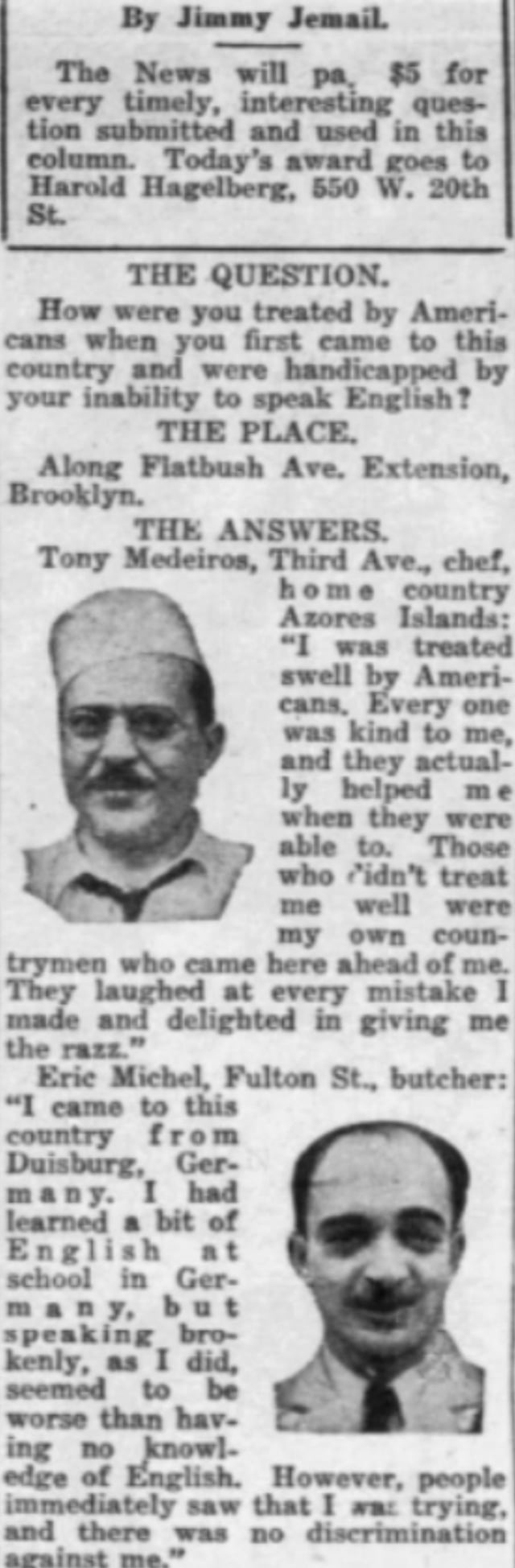 Inquiring Photographer:”How were you treated by Americans when you first came to this country and were handicapped by your inability to speak English?”January 22, 1938