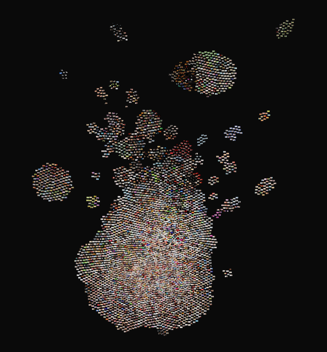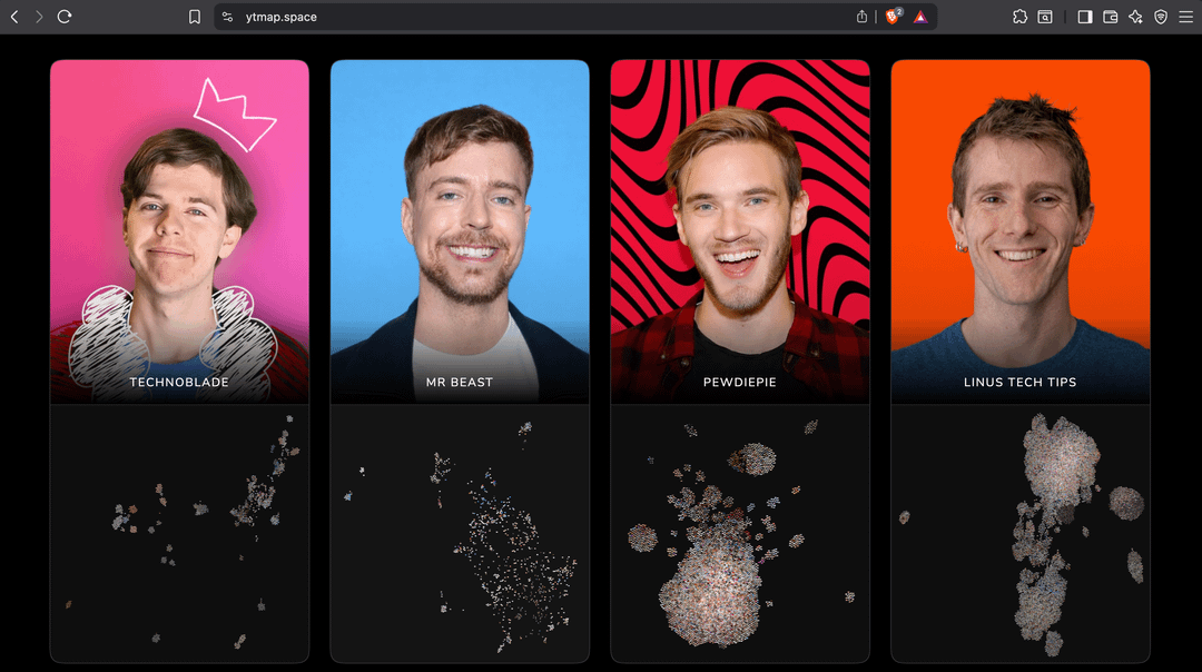 I generated embeddings for each video’s title and thumbnail, then used UMAP to reduce it to 2D and plotted it. Similar videos end up close together, so different types of content form clusters.