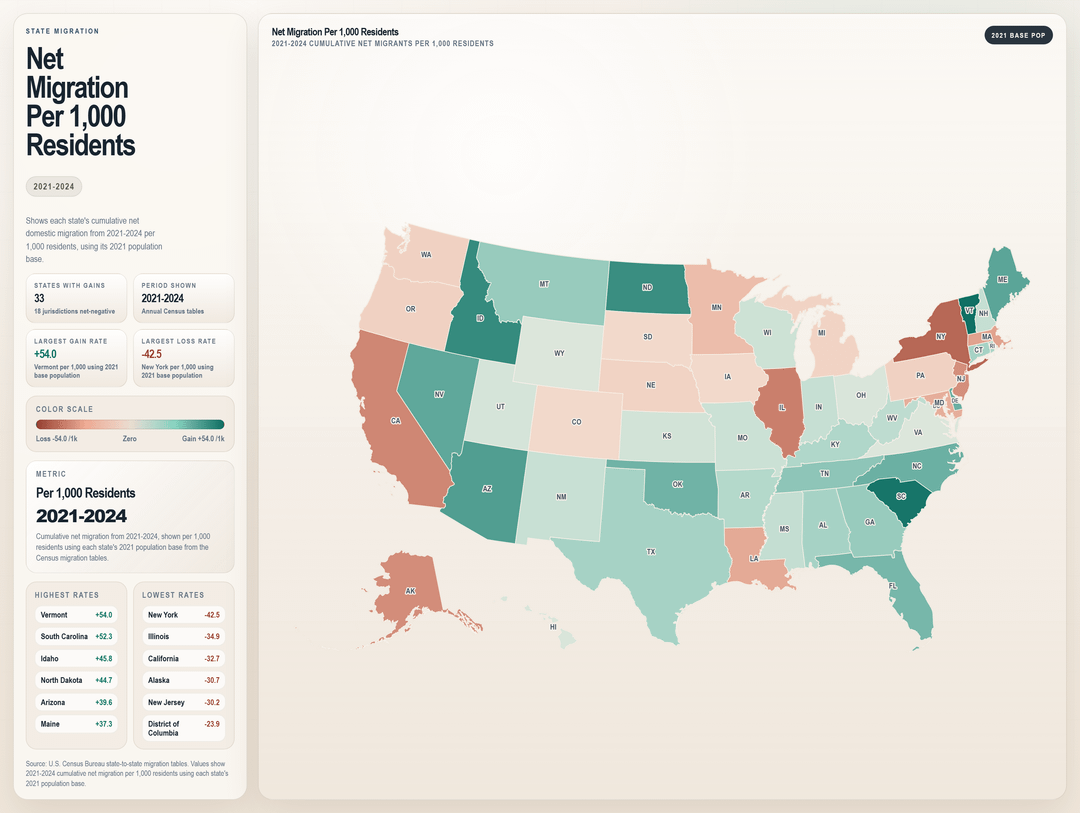Source: U.S. Census Bureau state-to-state migration tables, annual data for 2021 to 2024: