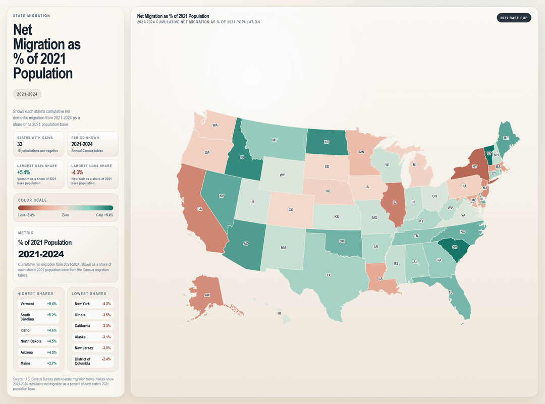 - cumulative net migration as a % of each state’s 2021 population (same story as #2)