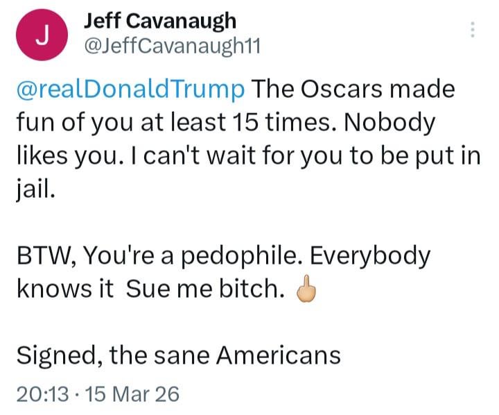 FattyMooseknuckle on March 16, 2026 3:38 am Sues any and everybody for any reason but not a single lawsuit against anyone who has ever called him a pedophile.