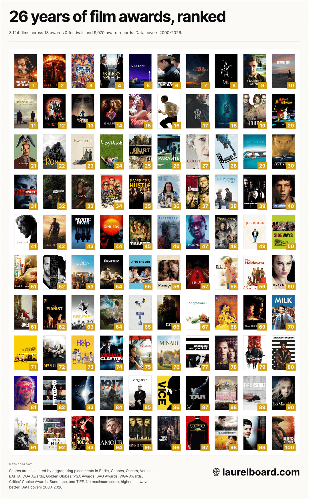 Each film earns points for wins, nominations, and festival selections, with bigger programs weighted more heavily. The idea isn’t really to say which films are “better”, but to see which ones received recognition across many different awards and festivals. The dataset currently includes 3,124 films from 2000 to 2026.