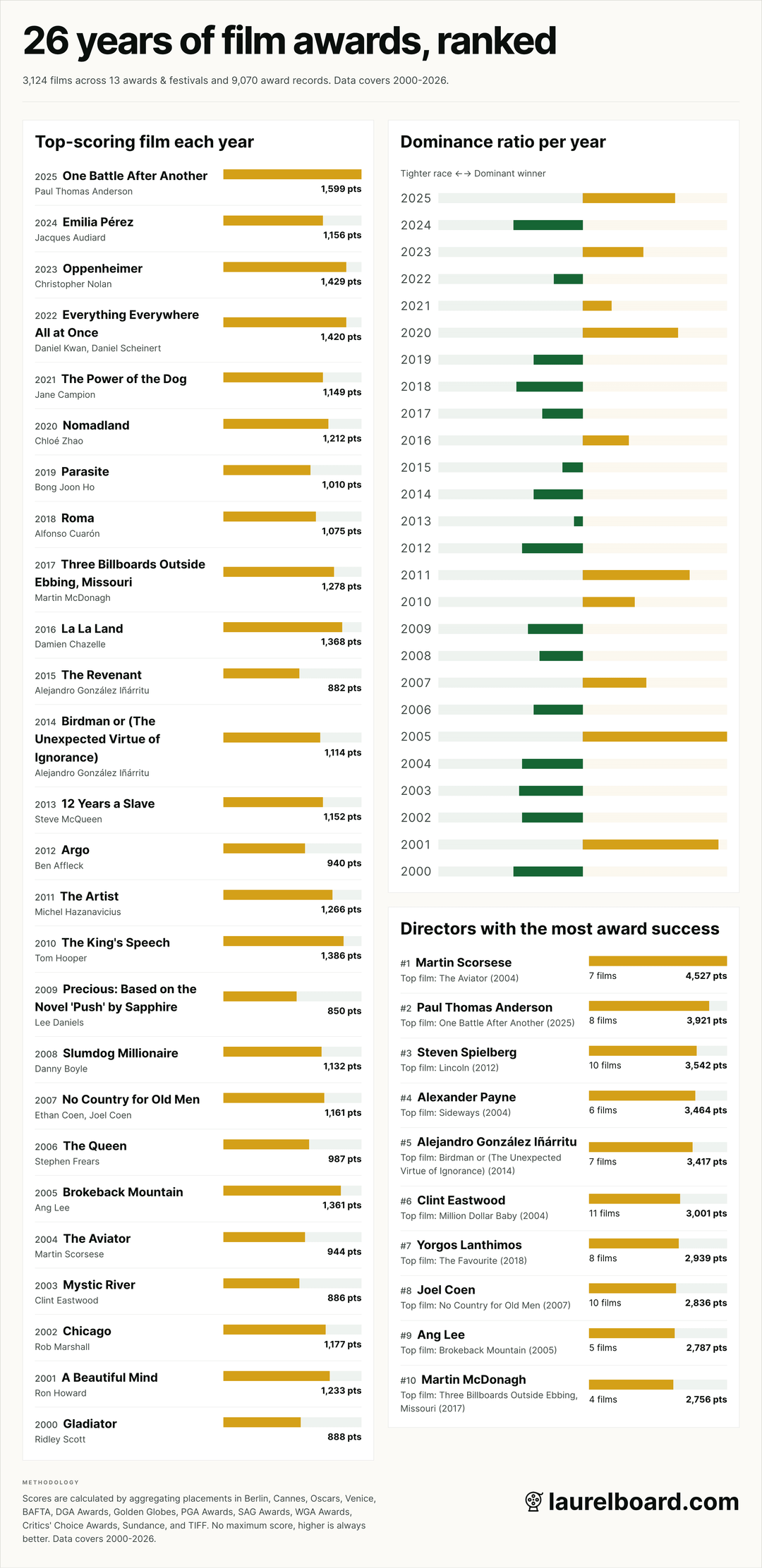 You can see how different some years are. Some have a clear winner, while others have several films with very similar scores. That’s what the dominance chart in the infographic is trying to show.