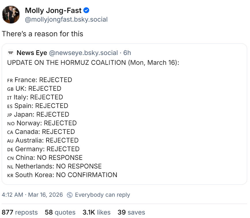 Trump put massive tariffs on us, threatened Greenland, insulted our dead soldiers, killed in a war we followed the US into in the first place and then last week told us he didn’t need our help and now he’s demanding we send our soldiers to die in another pointless war started by America. Of course we rejected his demand to join his coalition.