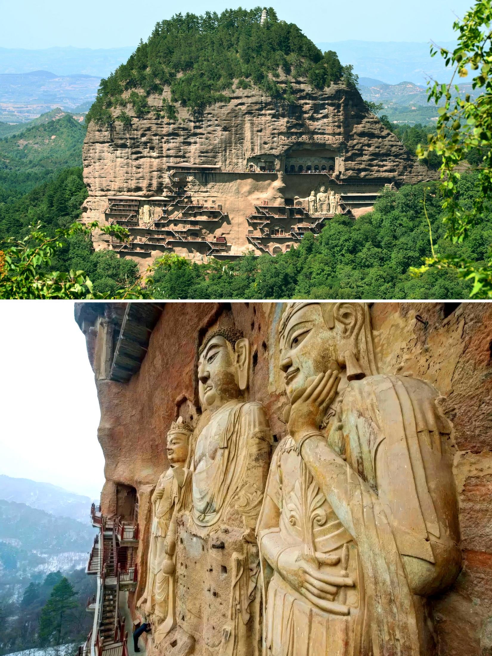Large Buddhist reliefs carved on the side of a mountain at the Maijishan Grottoes. They depict the Three Worthies of Huayan: Sakyamuni, Vairocana, and Manjusri. China, Sui dynasty, 5th-6th century AD [1650×2200]