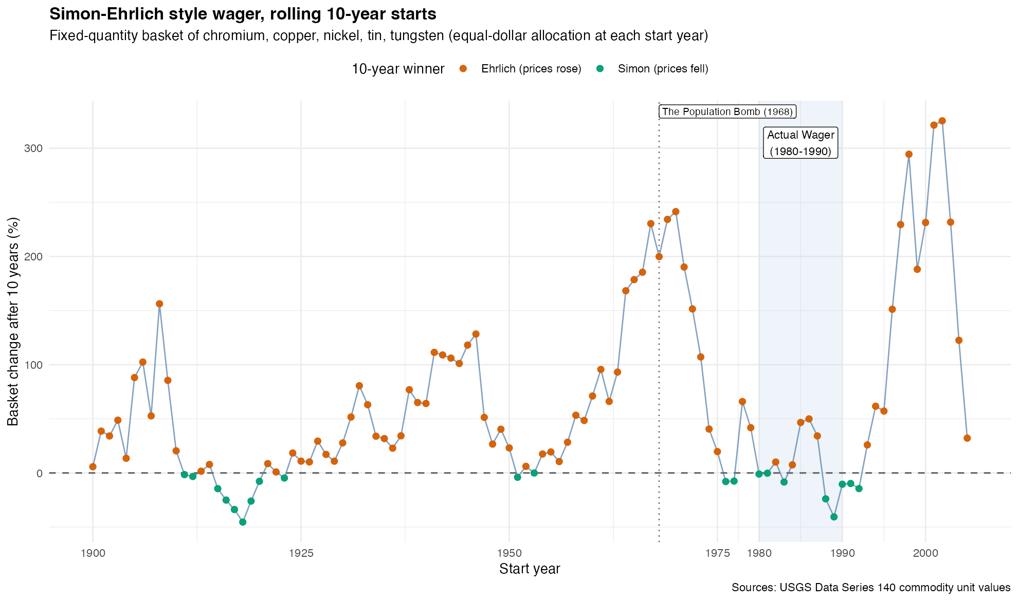 I thought it would be interesting to see when he would have lost and when he would have won the bet. R package code and data [here](https://gist.github.com/cavedave/614ddd0e92875ec6f4209bfbe0b85995) Data from [here](https://www.usgs.gov/centers/national-minerals-information-center/historical-statistics-mineral-commodities-united) USGS Data Series 140 (5 metals: chromium, copper, nickel, tin, tungsten it is not updated for all the metals recently.